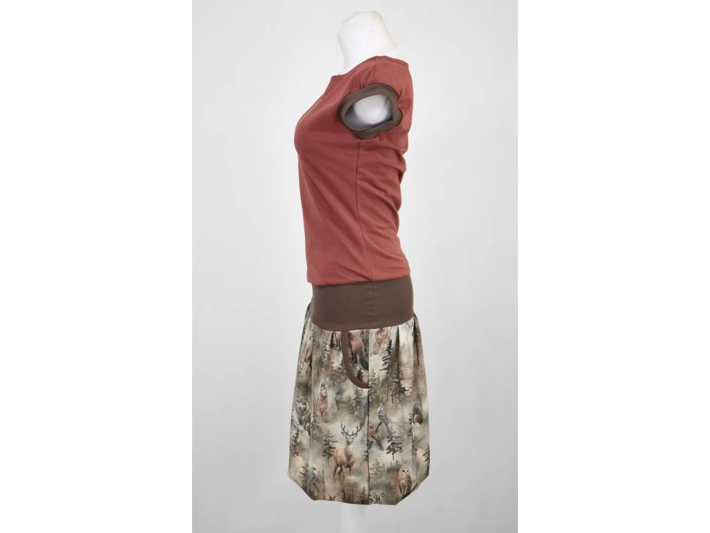 Dámská šatovka přestřižená v bocích ve variantě s nápletem, stažené gumičkou. Sukně je vypodšívkovaná s kapsami v bocích, průramky lemované úpletem. Dá se nosit samotná bez rukávů, anebo s tričkem.. :)