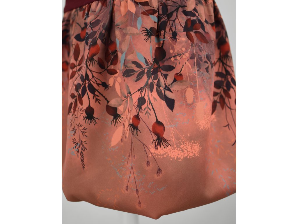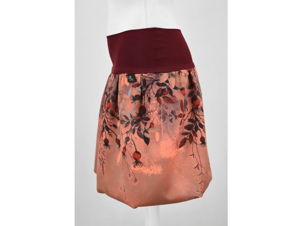 Dámská sukně balonového střihu s dvojitým elastickým pasovým okrajem vhodným pro většinu velikostí. Podšité polyesterovou látkou, která je vhodná jak na punčochy, tak holé nohy a sukně se dá nosit celoročně. Z rubu elastického pasu je nechán otvor na případné vložení gumy na zpevnění či stažení pasu – vhodné pro velikost XS.