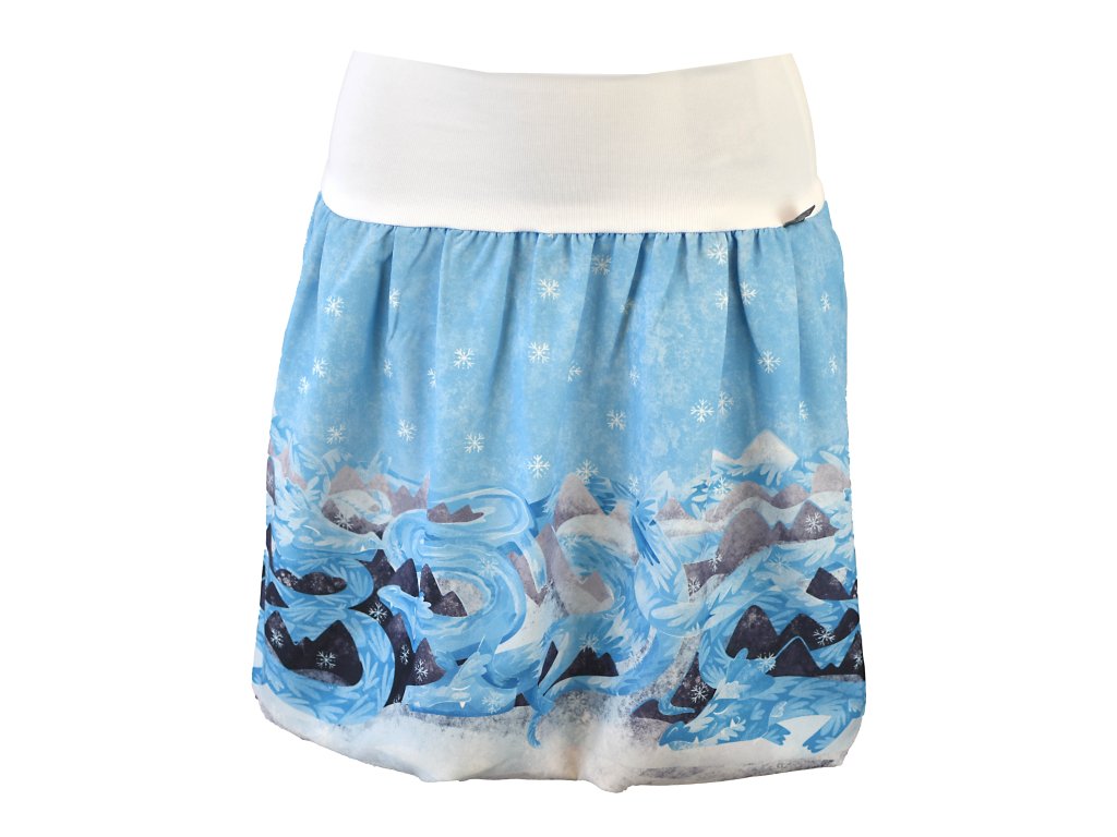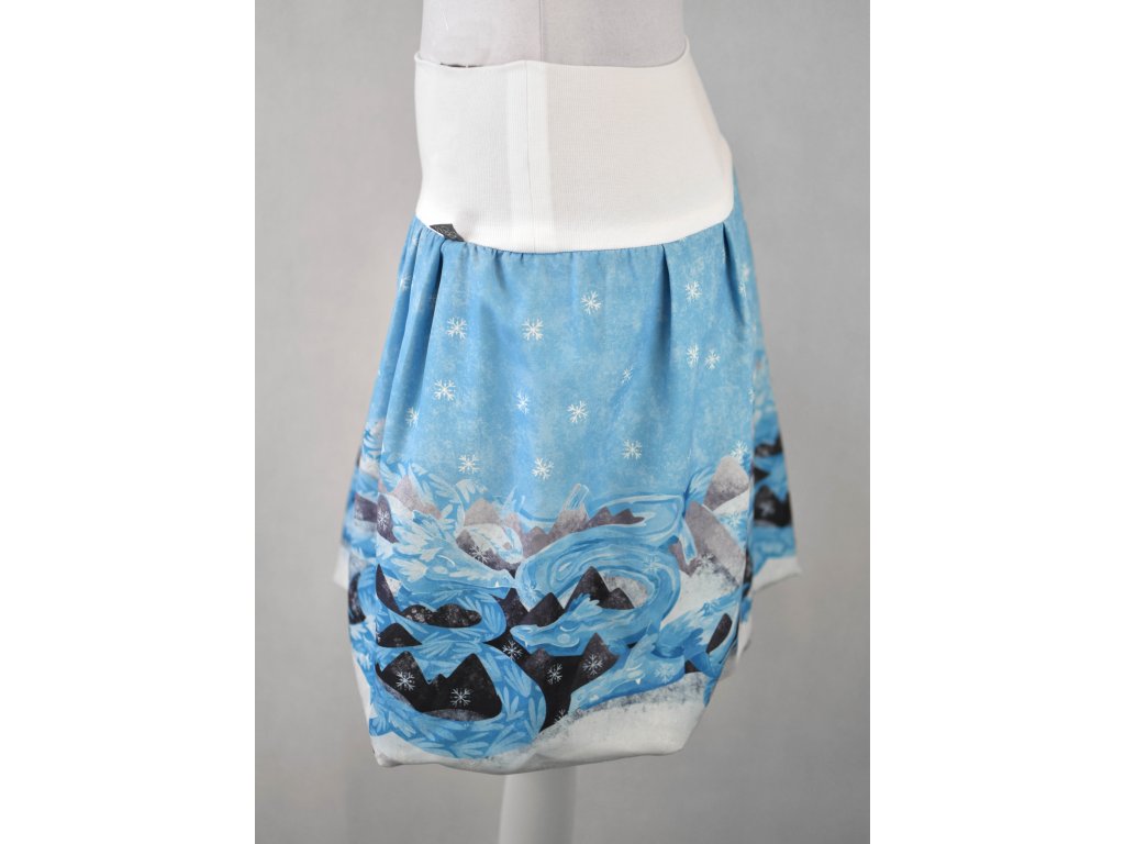 Dámská sukně balonového střihu s dvojitým elastickým pasovým okrajem vhodným pro většinu velikostí. Podšité polyesterovou látkou, která je vhodná jak na punčochy, tak holé nohy a sukně se dá nosit celoročně. Z rubu elastického pasu je nechán otvor na případné vložení gumy na zpevnění či stažení pasu – vhodné pro velikost XS.