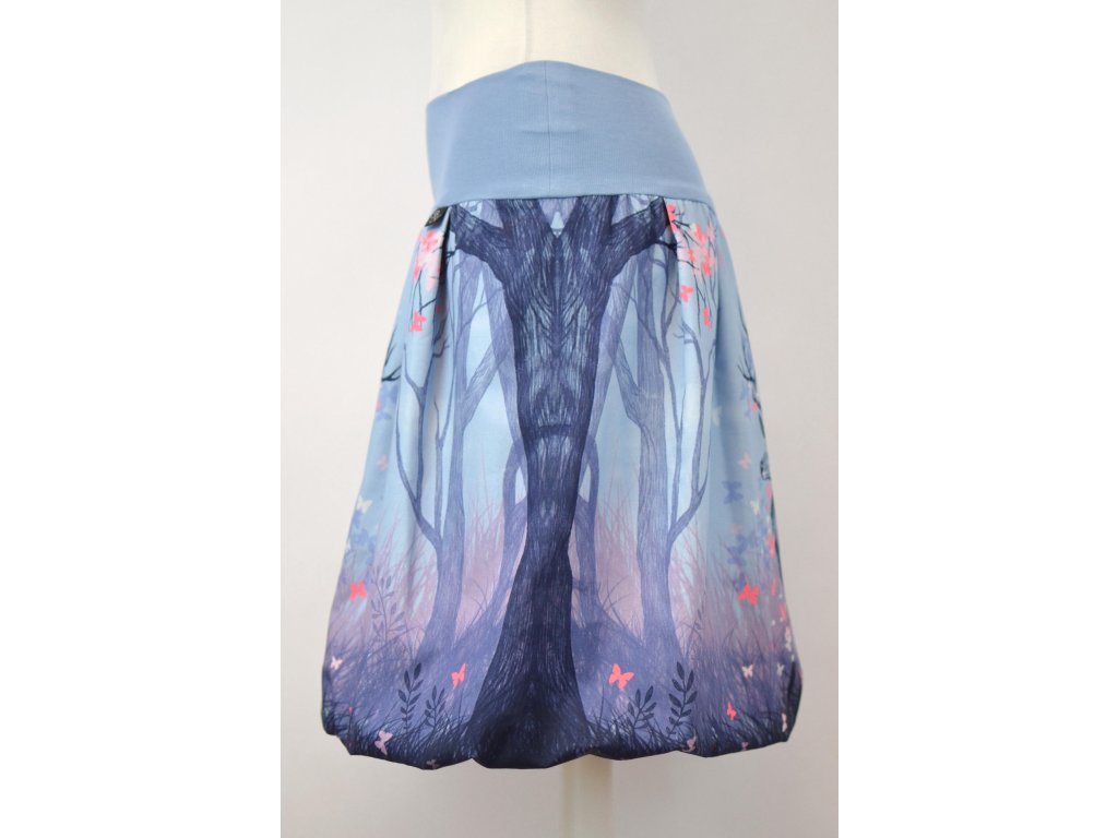 Dámská sukně balonového střihu s dvojitým elastickým pasovým okrajem vhodným pro většinu velikostí. Podšité polyesterovou látkou, která je vhodná jak na punčochy, tak na holé nohy a sukně se dá nosit celoročně. Z rubu elastického pasu je nechán otvor na případné vložení gumy na zpevnění či stažení pasu (vhodné pro velikost XS). Na látce se mohou vyskytnout jemné bílé tečky nebo jiné nedokonalosti.