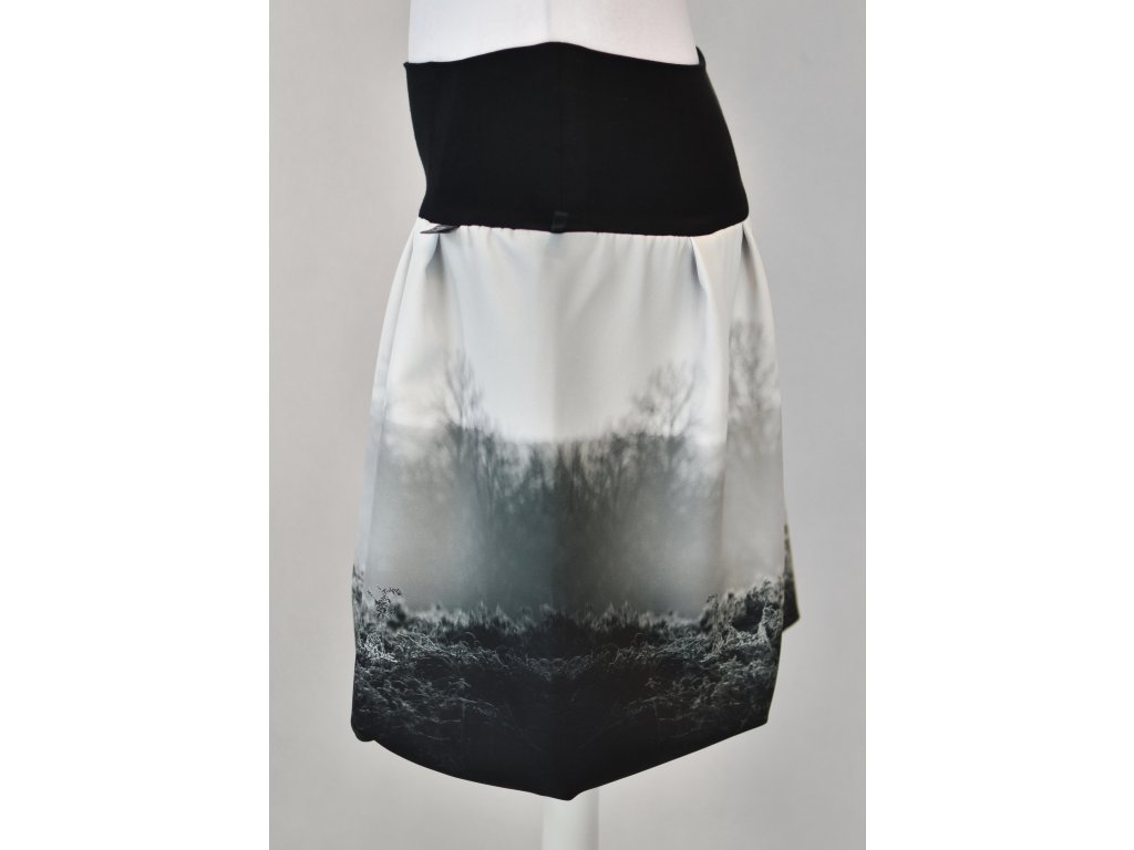 Dámská sukně balonového střihu s dvojitým elastickým pasovým okrajem vhodným pro většinu velikostí. Podšité polyesterovou látkou, která je vhodná jak na punčochy, tak na holé nohy a sukně se dá nosit celoročně. Z rubu elastického pasu je nechán otvor na případné vložení gumy na zpevnění či stažení pasu (vhodné pro velikost XS).