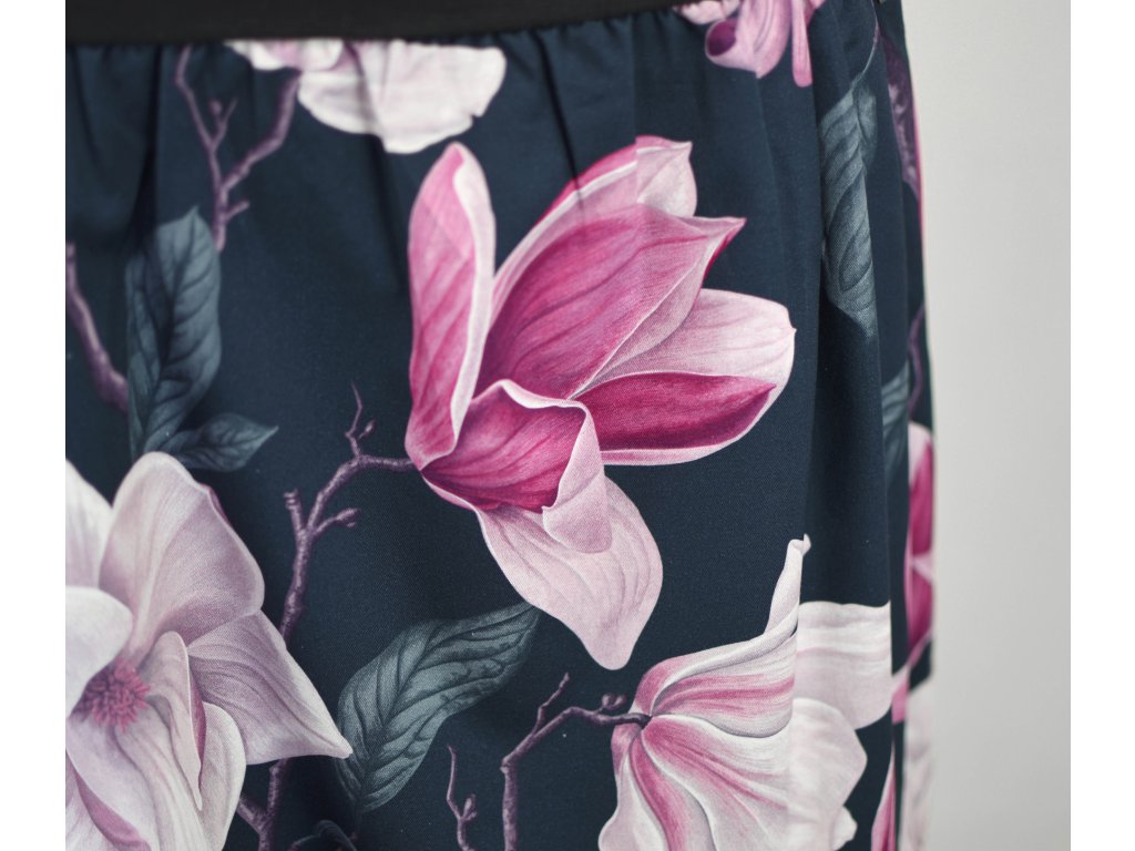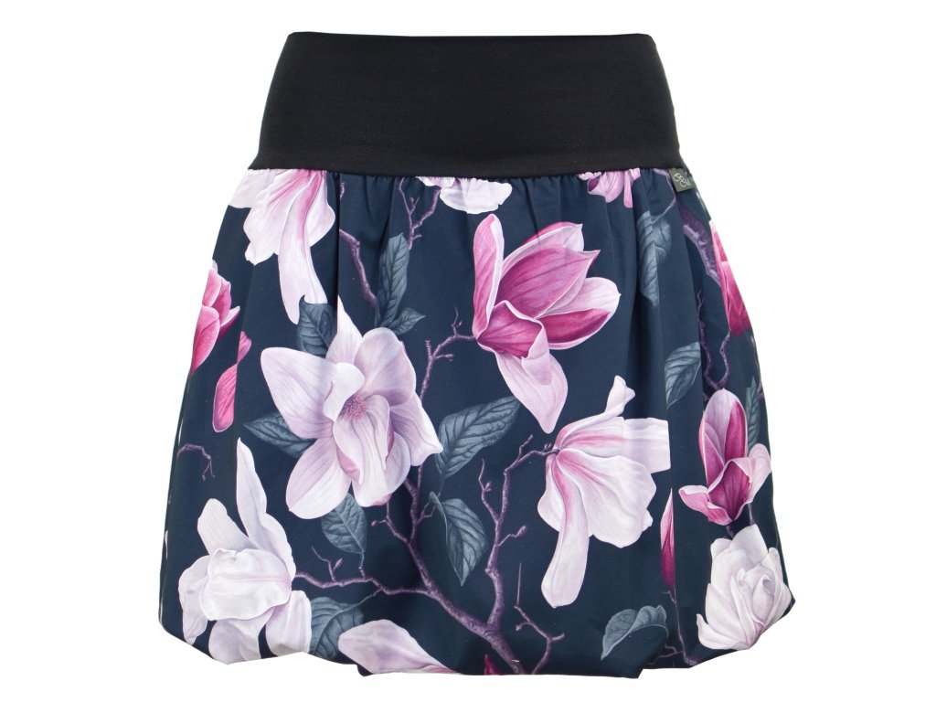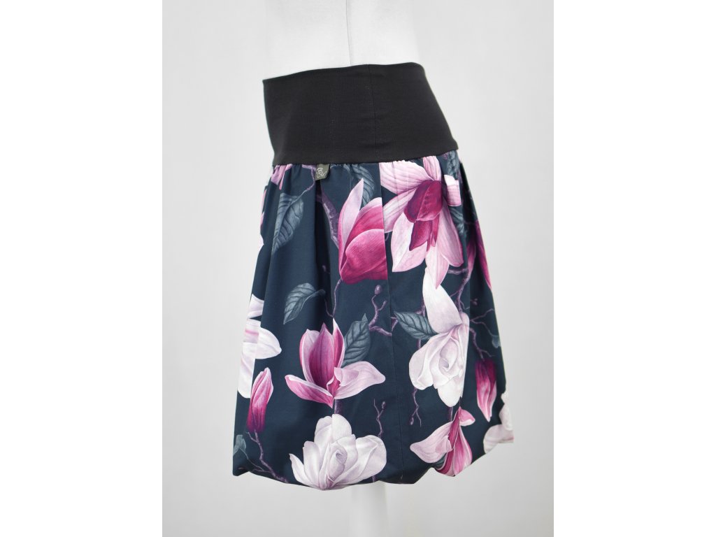Dámská sukně balonového střihu s dvojitým elastickým pasovým okrajem vhodným pro většinu velikostí. Podšité polyesterovou látkou, která je vhodná jak na punčochy, tak holé nohy a sukně se dá nosit celoročně. Z rubu elastického pasu je nechán otvor na případné vložení gumy na zpevnění či stažení pasu – vhodné pro velikost XS.