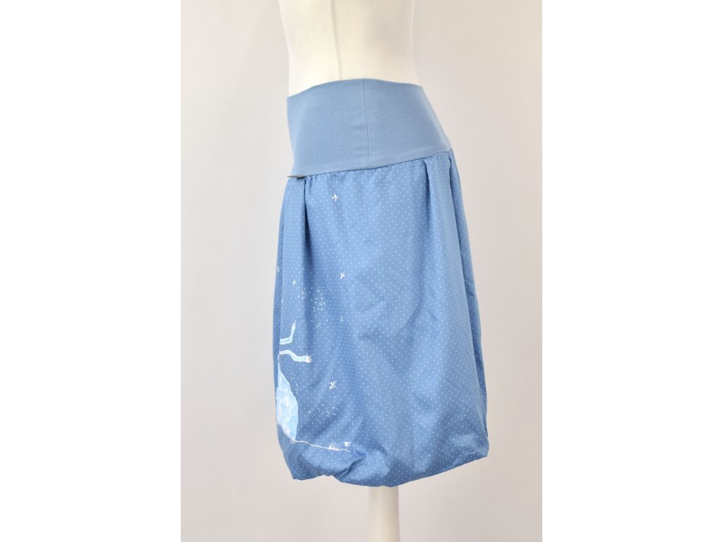 Dámská sukně balonového střihu s dvojitým elastickým pasovým okrajem vhodným pro většinu velikostí. Podšité polyesterovou látkou, která je vhodná jak na punčochy, tak na holé nohy a sukně se dá nosit celoročně. Z rubu elastického pasu je nechán otvor na případné vložení gumy na zpevnění či stažení pasu (vhodné pro velikost XS).