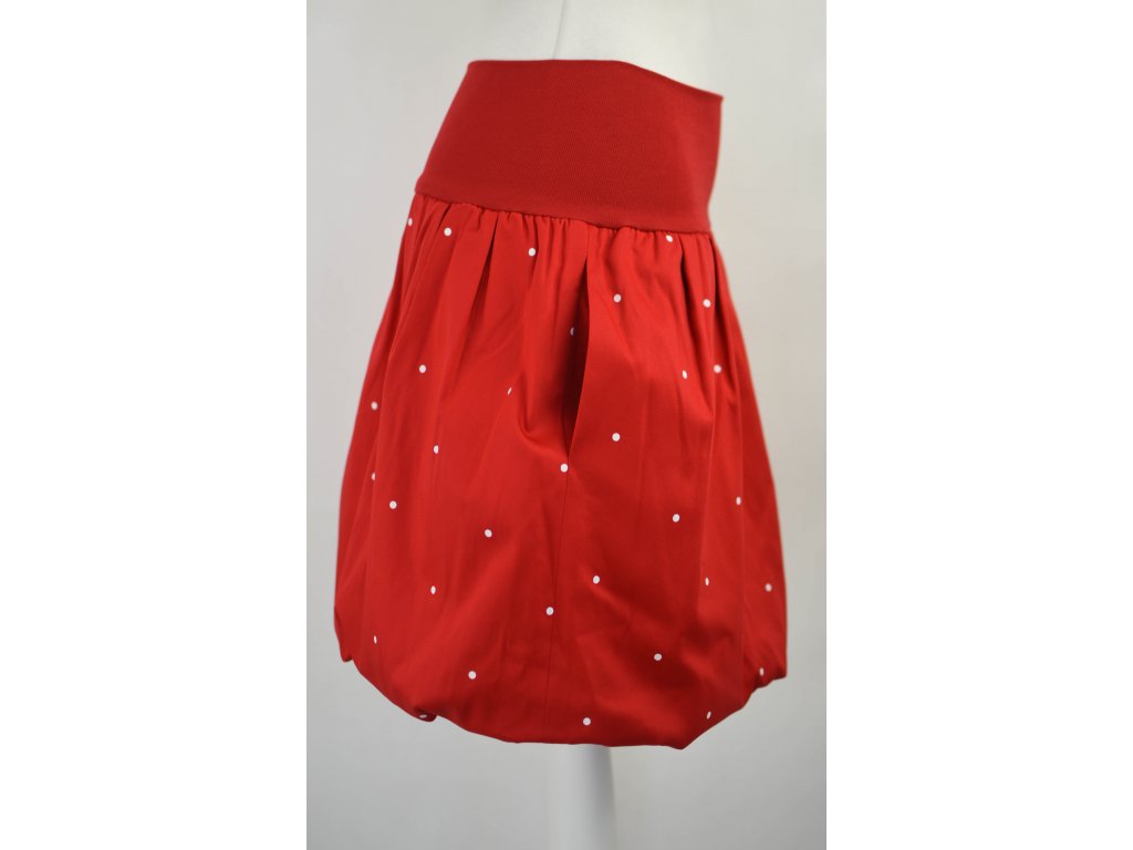 Dámská sukně balonového střihu s dvojitým elastickým pasovým okrajem vhodným pro většinu velikostí. Podšité polyesterovou látkou, která je vhodná jak na punčochy, tak holé nohy a sukně se dá nosit celoročně. Z rubu elastického pasu je nechán otvor na případné vložení gumy na zpevnění či stažení pasu – vhodné pro velikost XS.