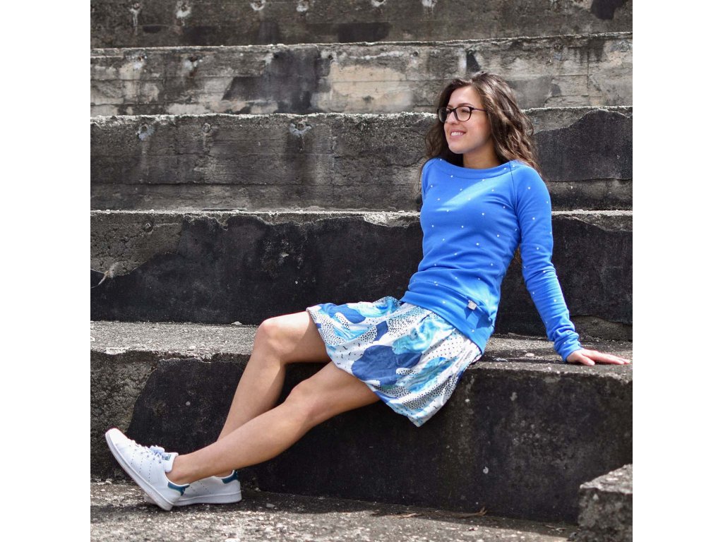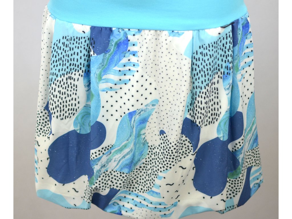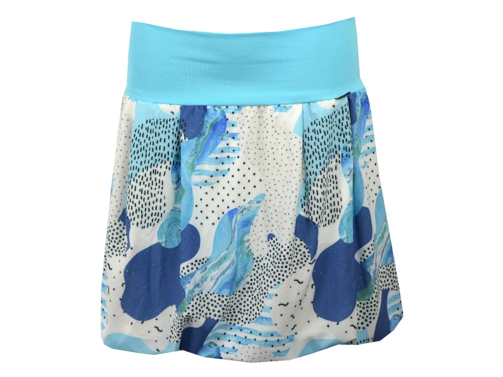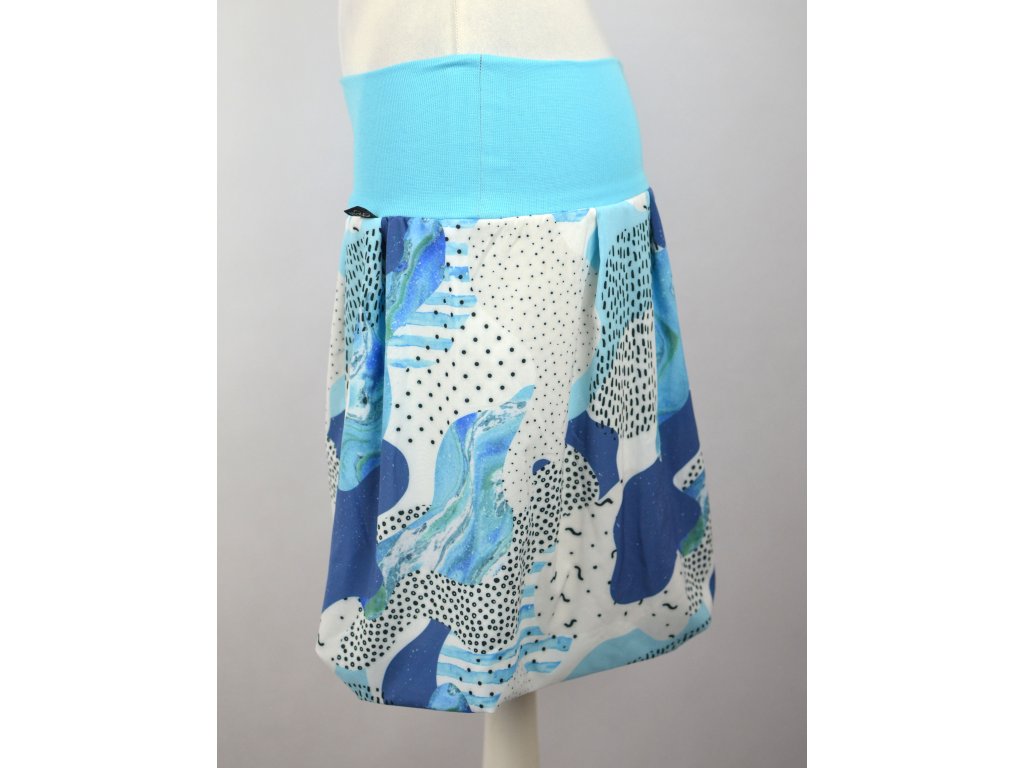 Dámská sukně balonového střihu s dvojitým elastickým pasovým okrajem vhodným pro většinu velikostí. Podšité polyesterovou látkou, která je vhodná jak na punčochy, tak na holé nohy a sukně se dá nosit celoročně. Z rubu elastického pasu je nechán otvor na případné vložení gumy na zpevnění či stažení pasu (vhodné pro velikost XS).
