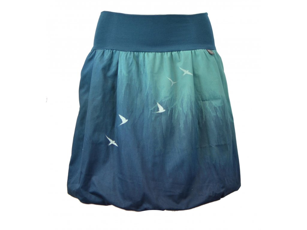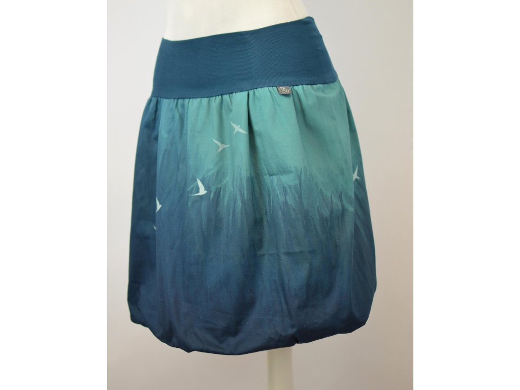Dámská sukně balonového střihu s dvojitým elastickým pasovým okrajem vhodným pro většinu velikostí. Podšité polyesterovou látkou, která je vhodná jak na punčochy, tak na holé nohy a sukně se dá nosit celoročně. Z rubu elastického pasu je nechán otvor na případné vložení gumy na zpevnění či stažení pasu (vhodné pro velikost XS). Na látce se mohou vyskytnout jemné bílé tečky nebo jiné nedokonalosti.