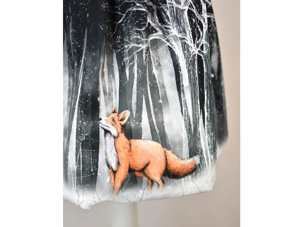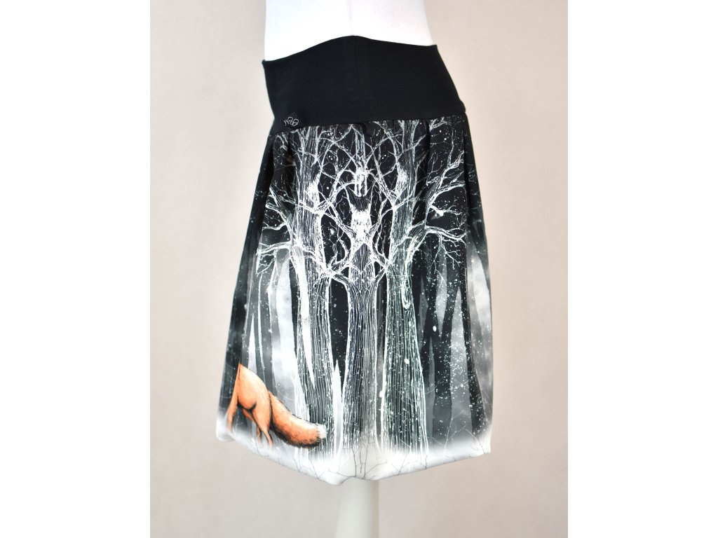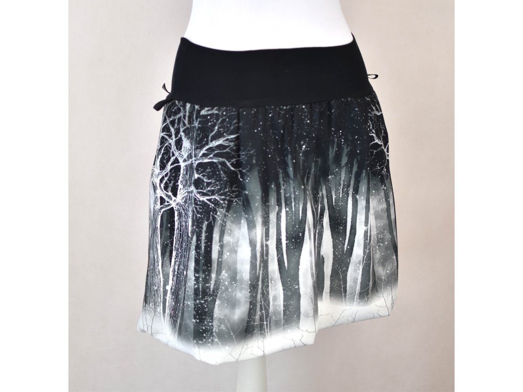 Dámská sukně balonového střihu s dvojitým elastickým pasovým okrajem vhodným pro většinu velikostí. Podšité polyesterovou látkou, která je vhodná jak na punčochy, tak na holé nohy a sukně se dá nosit celoročně. Z rubu elastického pasu je nechán otvor na případné vložení gumy na zpevnění či stažení pasu (vhodné pro velikost XS).