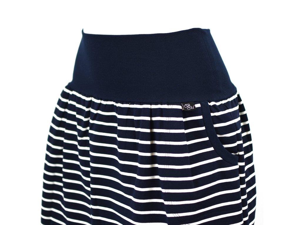 Dámská sukně balonového střihu s dvojitým elastickým pasovým okrajem vhodným pro většinu velikostí. Podšité polyesterovou látkou, která je vhodná jak na punčochy, tak holé nohy a sukně se dá nosit celoročně. Z rubu elastického pasu je nechán otvor na případné vložení gumy na zpevnění či stažení pasu – vhodné pro velikost XS.