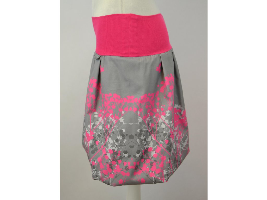 Dámská sukně balonového střihu s dvojitým elastickým pasovým okrajem vhodným pro většinu velikostí. Podšité polyesterovou látkou, která je vhodná jak na punčochy, tak holé nohy a sukně se dá nosit celoročně. Z rubu elastického pasu je nechán otvor na případné vložení gumy na zpevnění či stažení pasu – vhodné pro velikost XS.