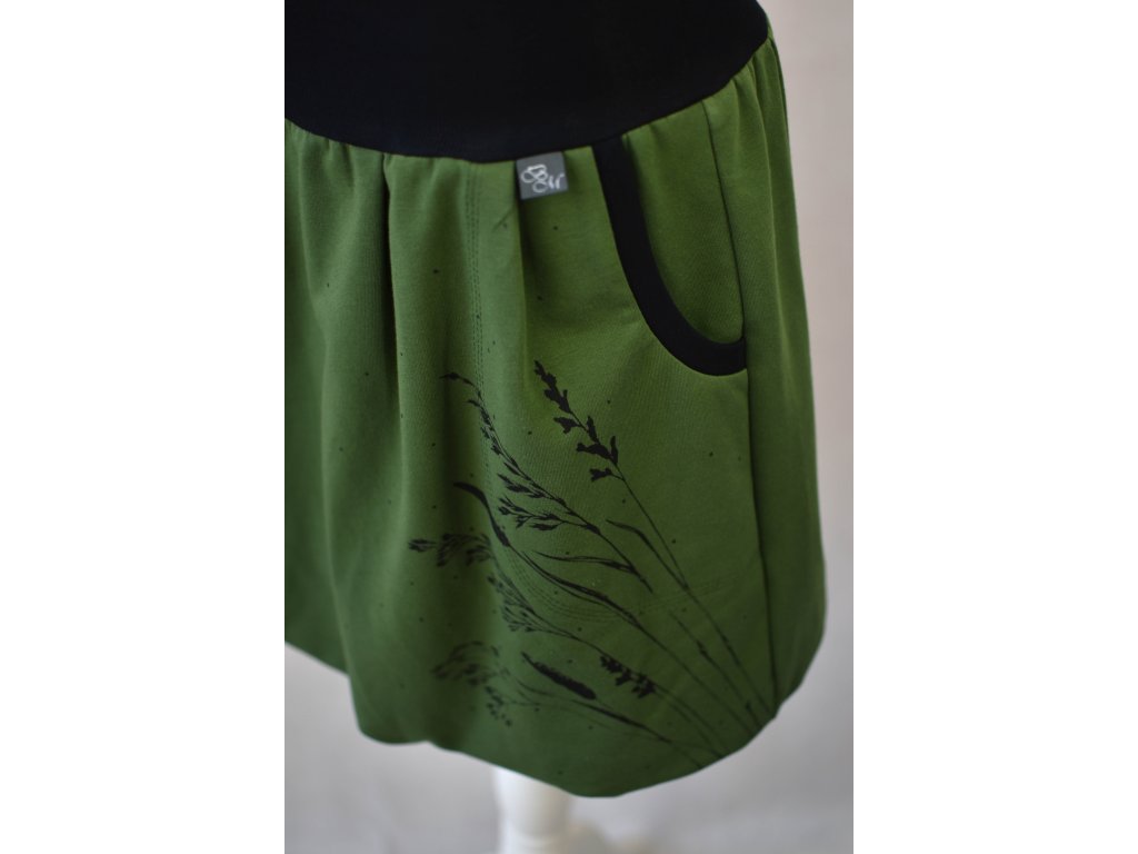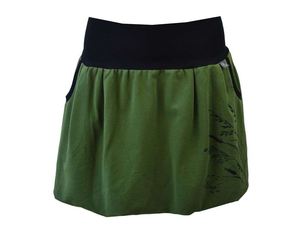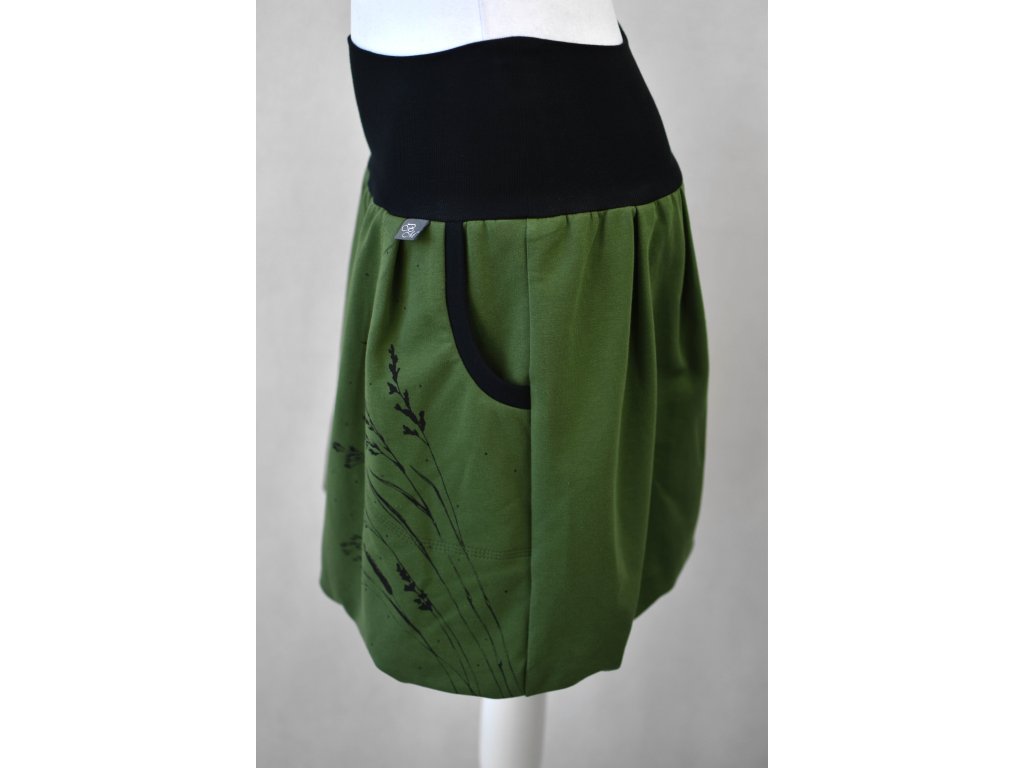 Dámská sukně balonového střihu s dvojitým elastickým pasovým okrajem vhodným pro většinu velikostí. Podšité polyesterovou látkou, která je vhodná jak na punčochy, tak na holé nohy a sukně se dá nosit celoročně. Z rubu elastického pasu je nechán otvor na případné vložení gumy na zpevnění či stažení pasu (vhodné pro velikost XS).