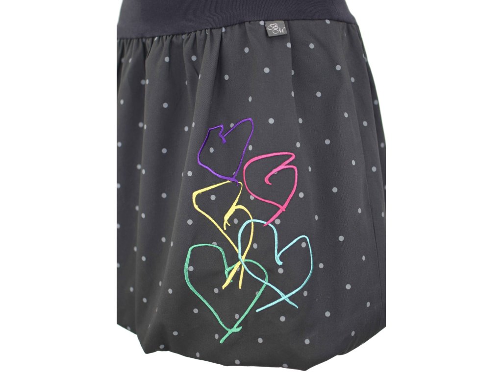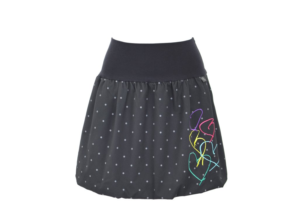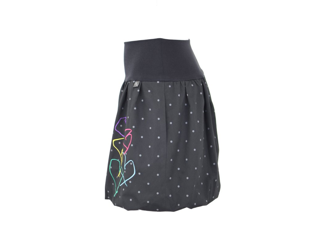 Dámská sukně balonového střihu s dvojitým elastickým pasovým okrajem vhodným pro většinu velikostí. Podšité polyesterovou látkou, která je vhodná jak na punčochy, tak holé nohy a sukně se dá nosit celoročně. Z rubu elastického pasu je nechán otvor na případné vložení gumy na zpevnění či stažení pasu – vhodné pro velikost XS.