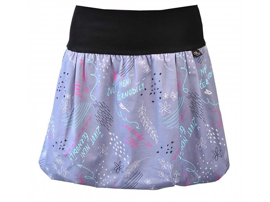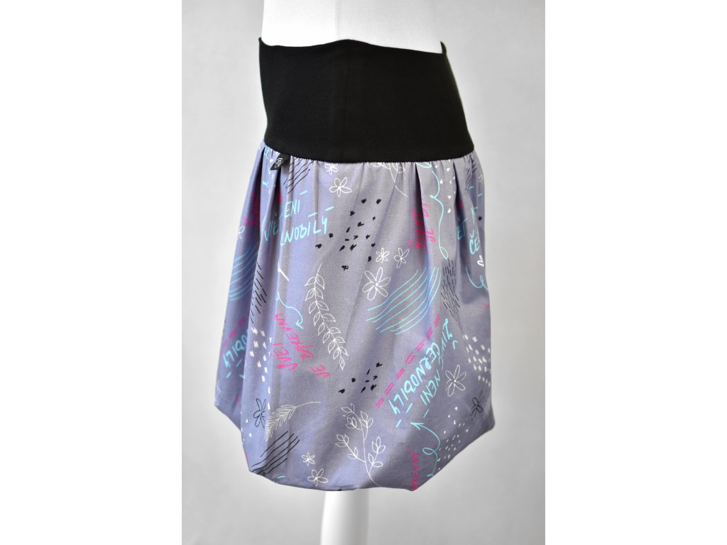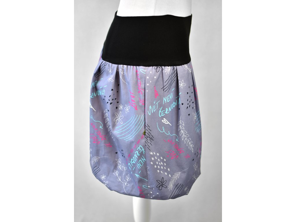 Dámská sukně balonového střihu s dvojitým elastickým pasovým okrajem vhodným pro většinu velikostí. Podšité polyesterovou látkou, která je vhodná jak na punčochy, tak holé nohy a sukně se dá nosit celoročně. Z rubu elastického pasu je nechán otvor na případné vložení gumy na zpevnění či stažení pasu – vhodné pro velikost XS.