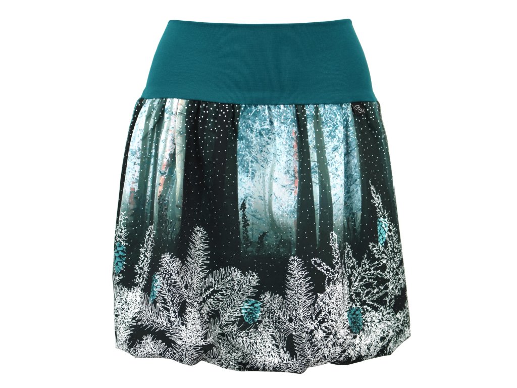 Dámská sukně balonového střihu s dvojitým elastickým pasovým okrajem vhodným pro většinu velikostí. Podšité polyesterovou látkou, která je vhodná jak na punčochy, tak holé nohy a sukně se dá nosit celoročně. Z rubu elastického pasu je nechán otvor na případné vložení gumy na zpevnění či stažení pasu – vhodné pro velikost XS.