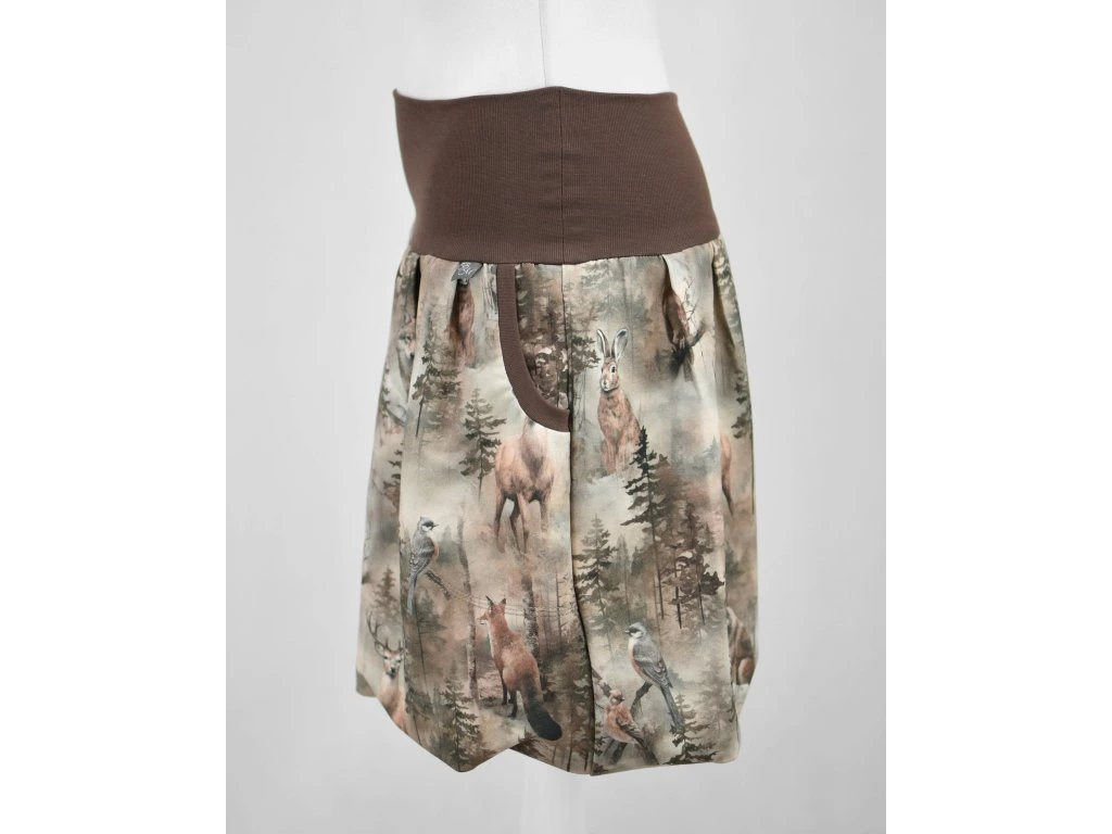 Dámská sukně balonového střihu s dvojitým elastickým pasovým okrajem vhodným pro většinu velikostí. Podšité polyesterovou látkou, která je vhodná jak na punčochy, tak holé nohy a sukně se dá nosit celoročně. Z rubu elastického pasu je nechán otvor na případné vložení gumy na zpevnění či stažení pasu – vhodné pro velikost XS.