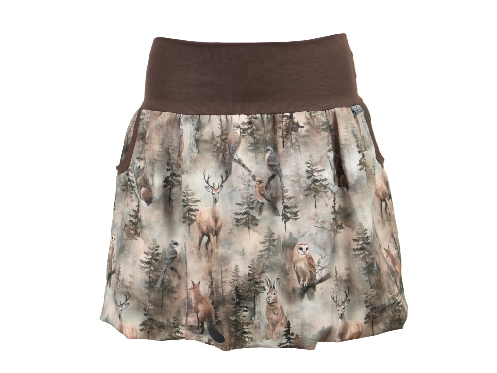 Dámská sukně balonového střihu s dvojitým elastickým pasovým okrajem vhodným pro většinu velikostí. Podšité polyesterovou látkou, která je vhodná jak na punčochy, tak holé nohy a sukně se dá nosit celoročně. Z rubu elastického pasu je nechán otvor na případné vložení gumy na zpevnění či stažení pasu – vhodné pro velikost XS.