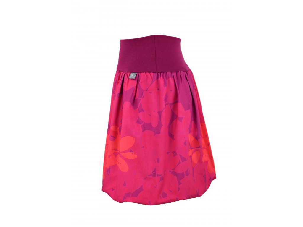 Dámská sukně balonového střihu s dvojitým elastickým pasovým okrajem vhodným pro většinu velikostí. Podšité polyesterovou látkou, která je vhodná jak na punčochy, tak holé nohy a sukně se dá nosit celoročně. Z rubu elastického pasu je nechán otvor na případné vložení gumy na zpevnění či stažení pasu – vhodné pro velikost XS. Motiv je zdobený výšivkou lístečků.