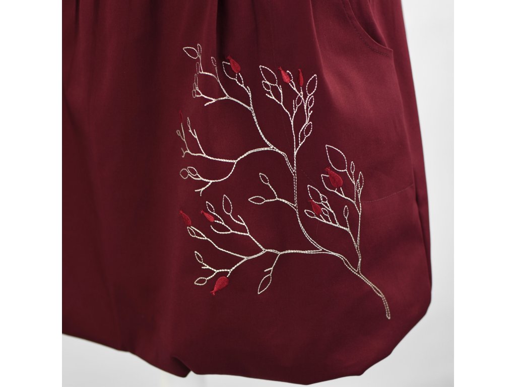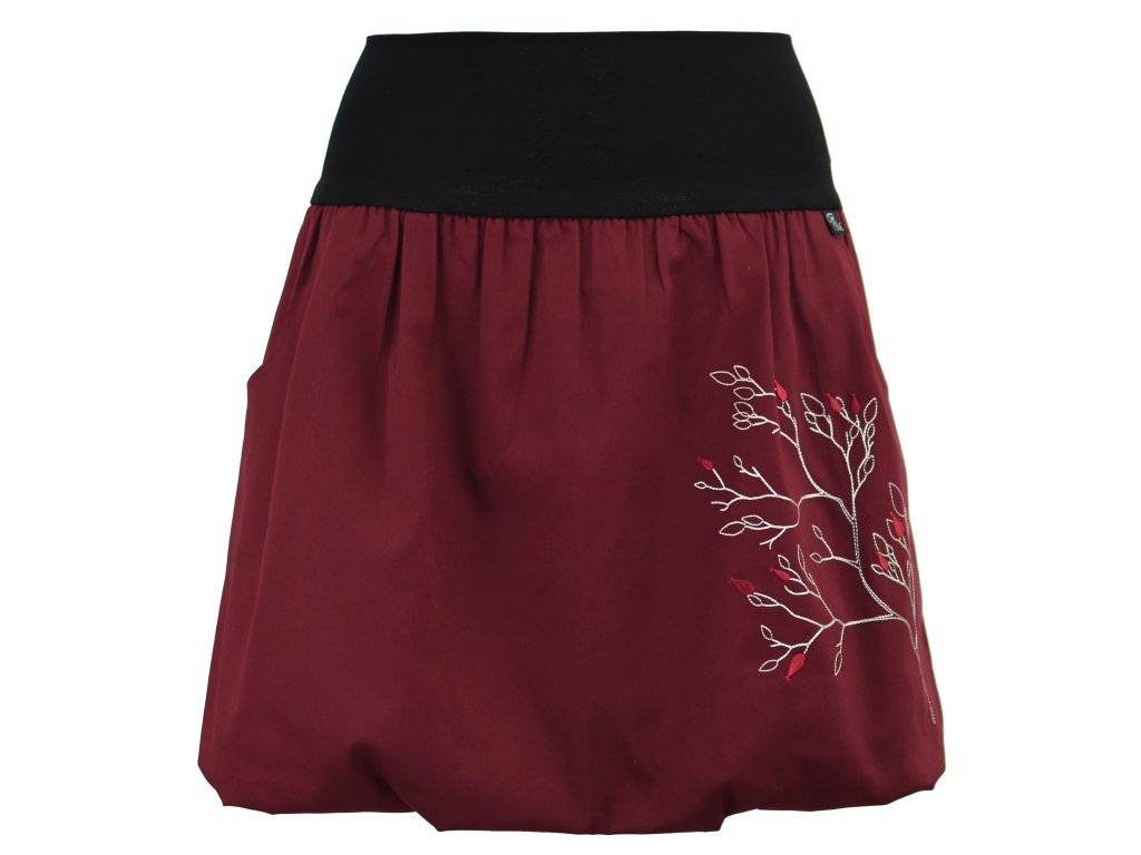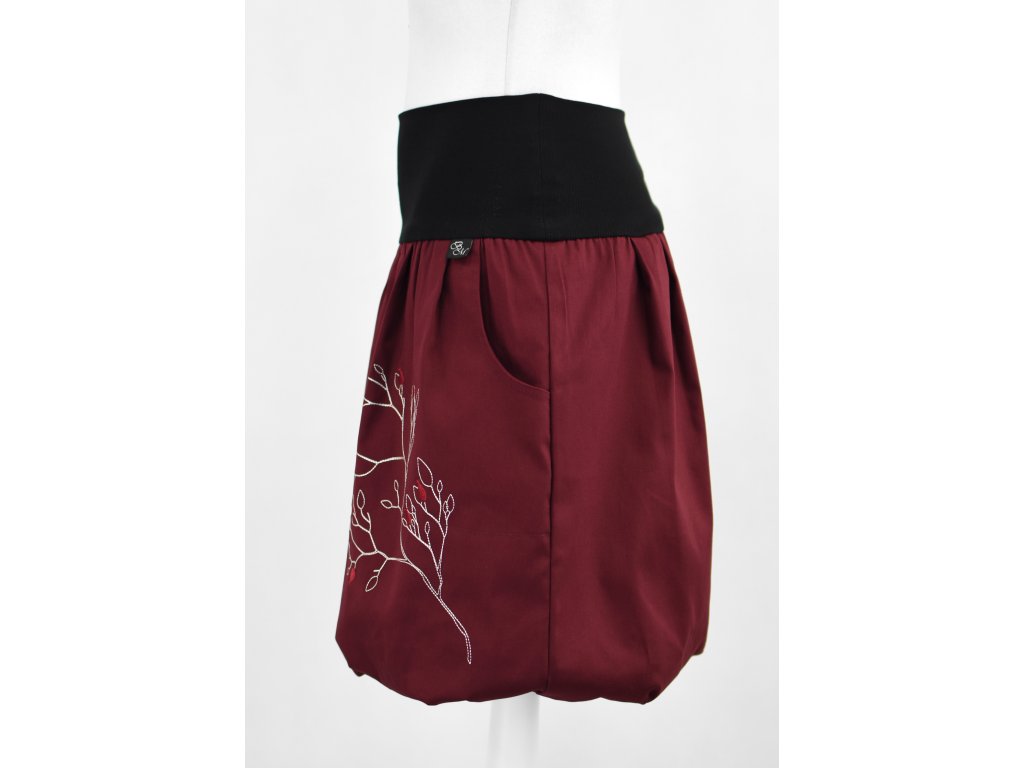 Dámská sukně balonového střihu s dvojitým elastickým pasovým okrajem vhodným pro většinu velikostí. Podšité polyesterovou látkou, která je vhodná jak na punčochy, tak holé nohy a sukně se dá nosit celoročně. Z rubu elastického pasu je nechán otvor na případné vložení gumy na zpevnění či stažení pasu – vhodné pro velikost XS.