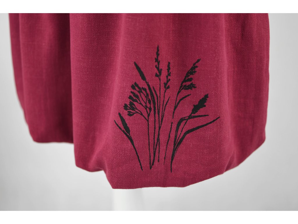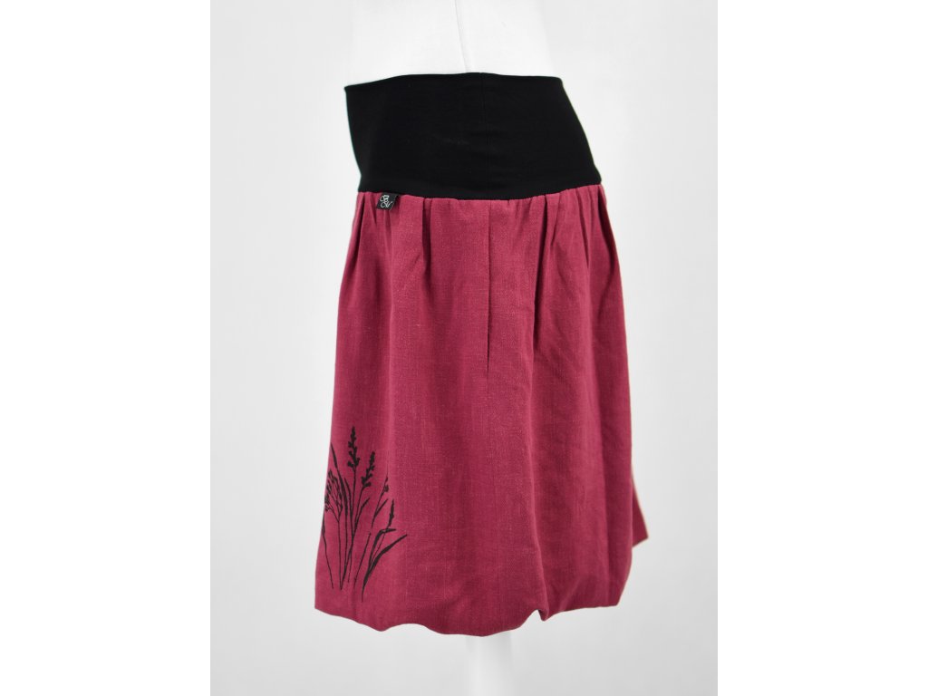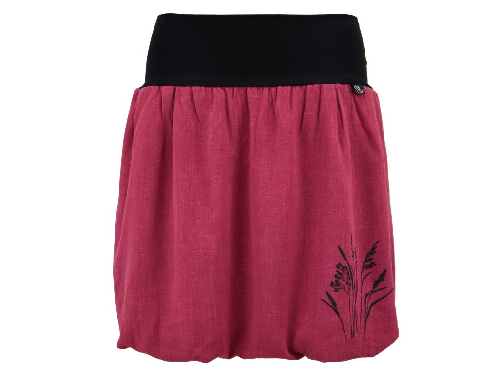Dámská sukně balonového střihu s dvojitým elastickým pasovým okrajem vhodným pro většinu velikostí. Podšité polyesterovou látkou, která je vhodná jak na punčochy, tak holé nohy a sukně se dá nosit celoročně. Z rubu elastického pasu je nechán otvor na případné vložení gumy na zpevnění či stažení pasu – vhodné pro velikost XS. Traviny jsou tvořeny metodou sítotisku.