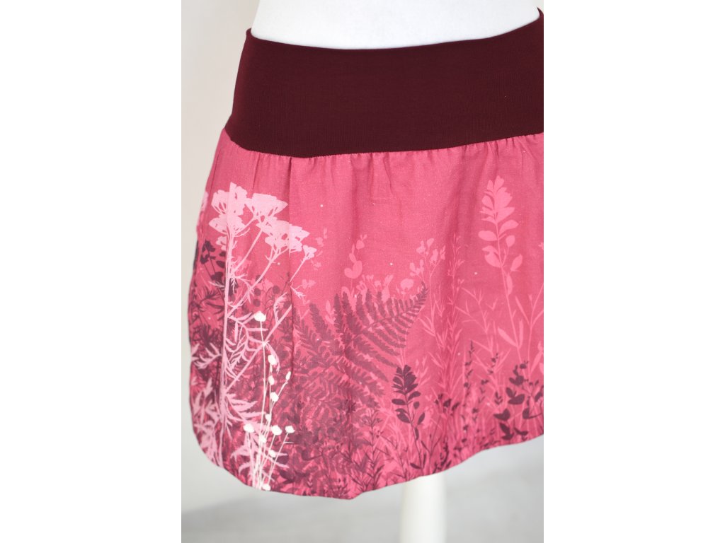 Dámská sukně balonového střihu s dvojitým elastickým pasovým okrajem vhodným pro většinu velikostí. Podšité podšívkou z bambusové viskózy, je příjemná na holé nohy, chladí a splývá. Z rubu elastického pasu je nechán otvor na případné vložení gumy na zpevnění či stažení pasu – vhodné pro velikost XS.