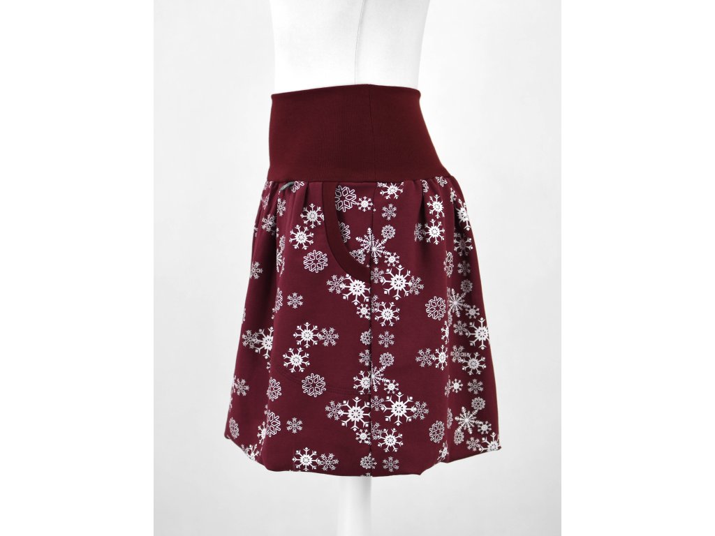 Dámská sukně balonového střihu s dvojitým elastickým pasovým okrajem vhodným pro většinu velikostí. Podšité polyesterovou látkou, která je vhodná jak na punčochy, tak holé nohy a sukně se dá nosit celoročně. Z rubu elastického pasu je nechán otvor na případné vložení gumy na zpevnění či stažení pasu – vhodné pro velikost XS. Látka zdobená potiskem vloček.
