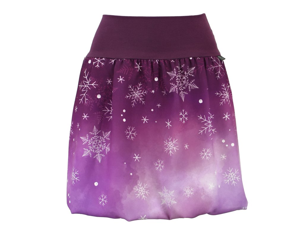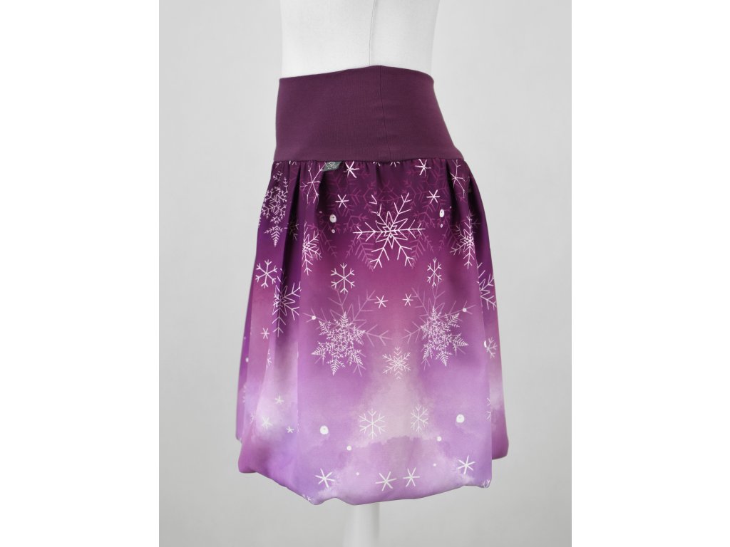 Dámská sukně balonového střihu s dvojitým elastickým pasovým okrajem vhodným pro většinu velikostí. Podšité polyesterovou látkou, která je vhodná jak na punčochy, tak holé nohy a sukně se dá nosit celoročně. Z rubu elastického pasu je nechán otvor na případné vložení gumy na zpevnění či stažení pasu – vhodné pro velikost XS.