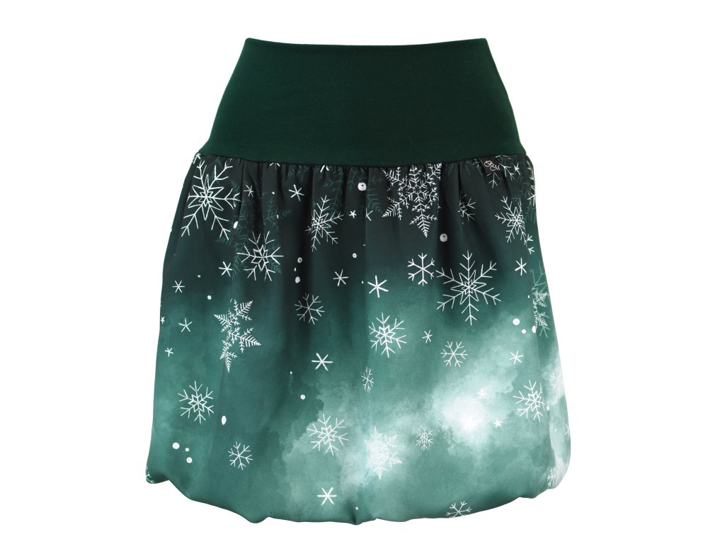 Dámská sukně balonového střihu s dvojitým elastickým pasovým okrajem vhodným pro většinu velikostí. Podšité polyesterovou látkou, která je vhodná jak na punčochy, tak holé nohy a sukně se dá nosit celoročně. Z rubu elastického pasu je nechán otvor na případné vložení gumy na zpevnění či stažení pasu – vhodné pro velikost XS.