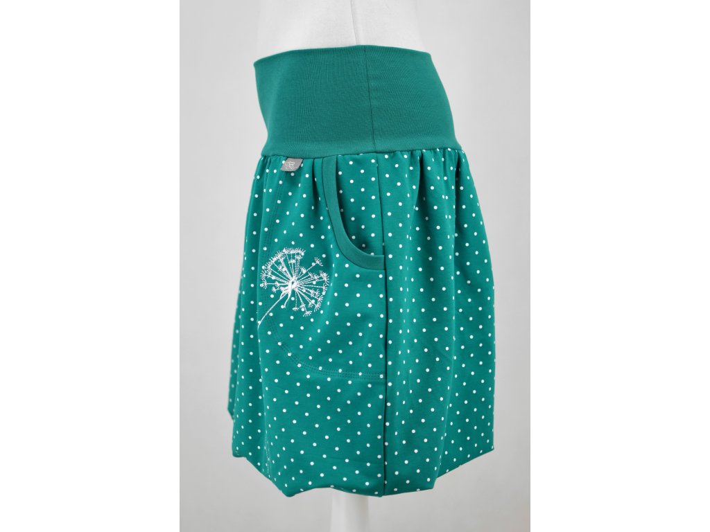 Dámská sukně balonového střihu s dvojitým elastickým pasovým okrajem vhodným pro většinu velikostí. Podšité polyesterovou látkou, která je vhodná jak na punčochy, tak holé nohy a sukně se dá nosit celoročně. Z rubu elastického pasu je nechán otvor na případné vložení gumy na zpevnění či stažení pasu – vhodné pro velikost XS.