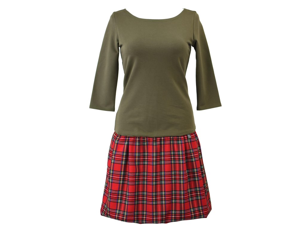 Dámské šaty s 3/4 rukávem přestřižené v bocích s gumičkou, dají se tak podkasat. Sukně je vypodšívkovaná, kapsa jedna skrytá na pravé straně.