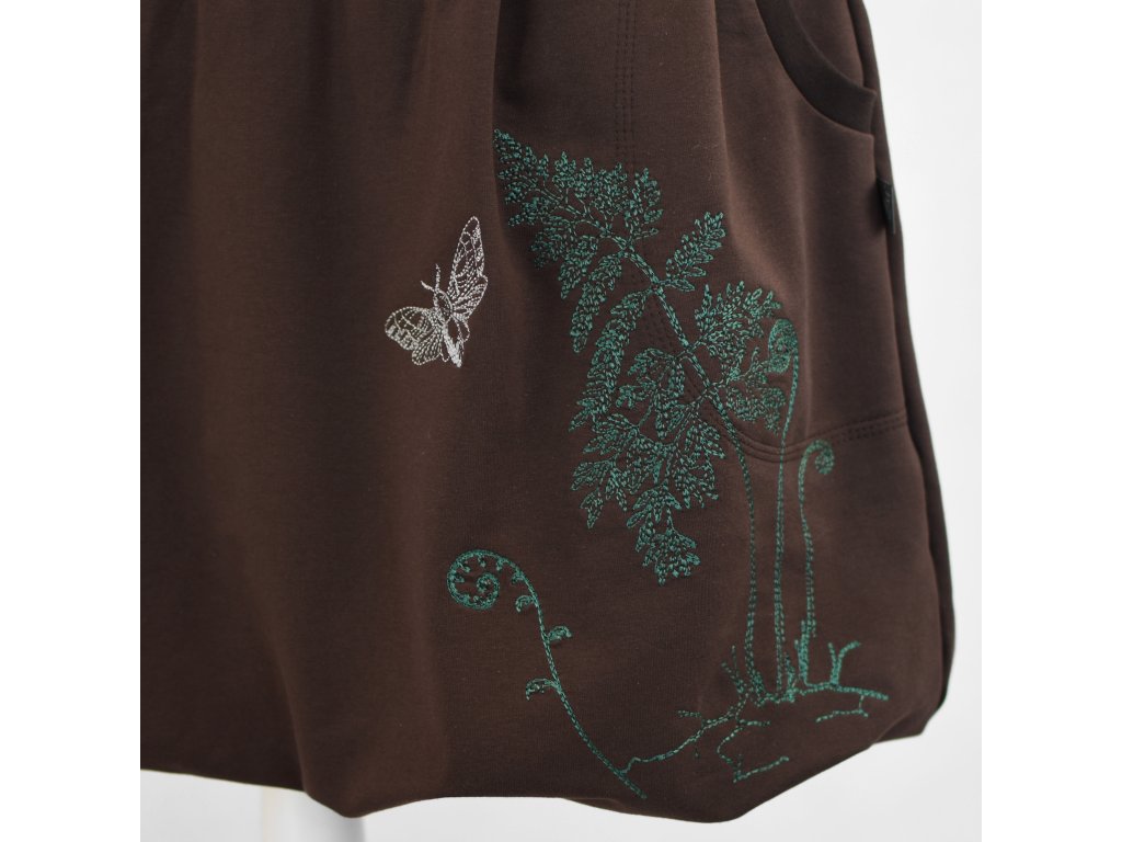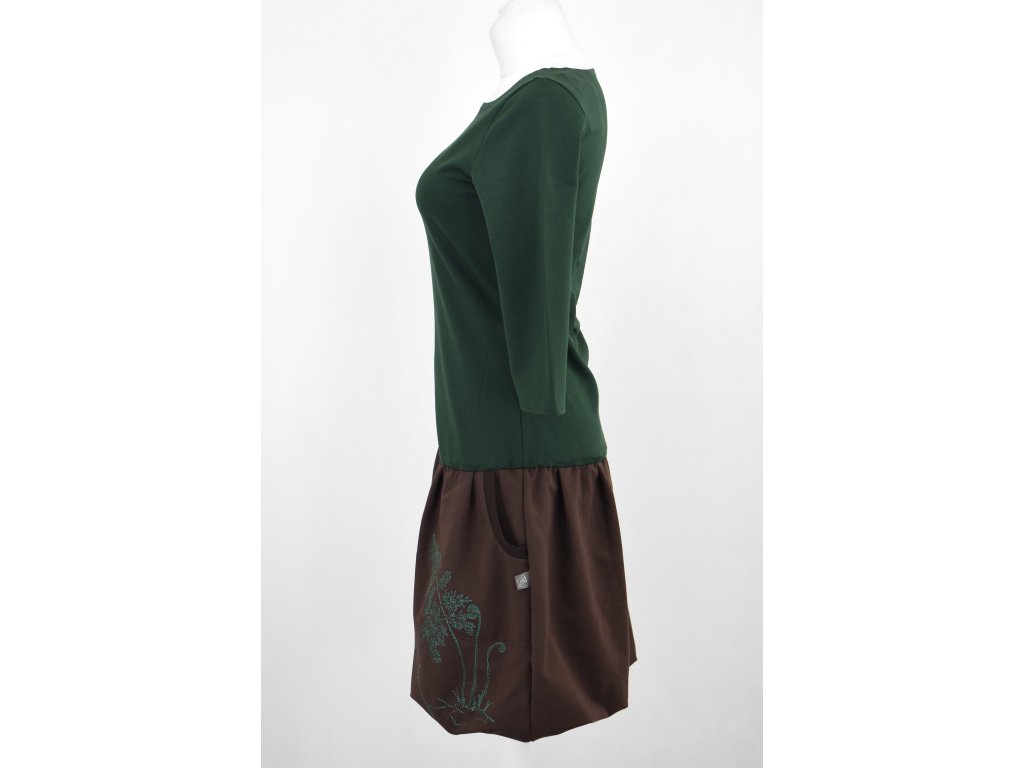 Dámské šaty s 3/4 rukávem přestřižené v bocích s gumičkou, dají se tak podkasat. Sukně je vypodšívkovaná, dvě kapsy v bocích.