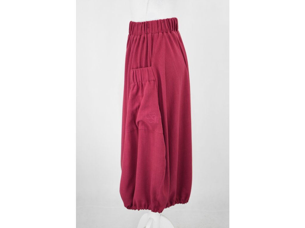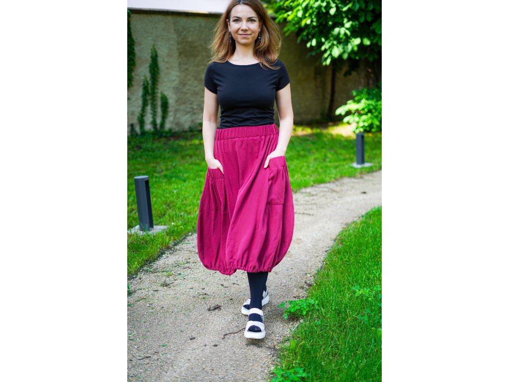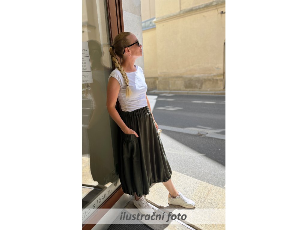 Dámská sukně áčkového až rovnějšího střihu zakončená gumičkou pro balonový efekt. Přední strana je tvořena třemi díly, kterým dominují dvě velké přiznané kapsy. V pase je skrytá guma, sukně nemá podšívku. Guma ve volnější než obvykle a sukně se dá nosit ve sníženém pase/bocích.