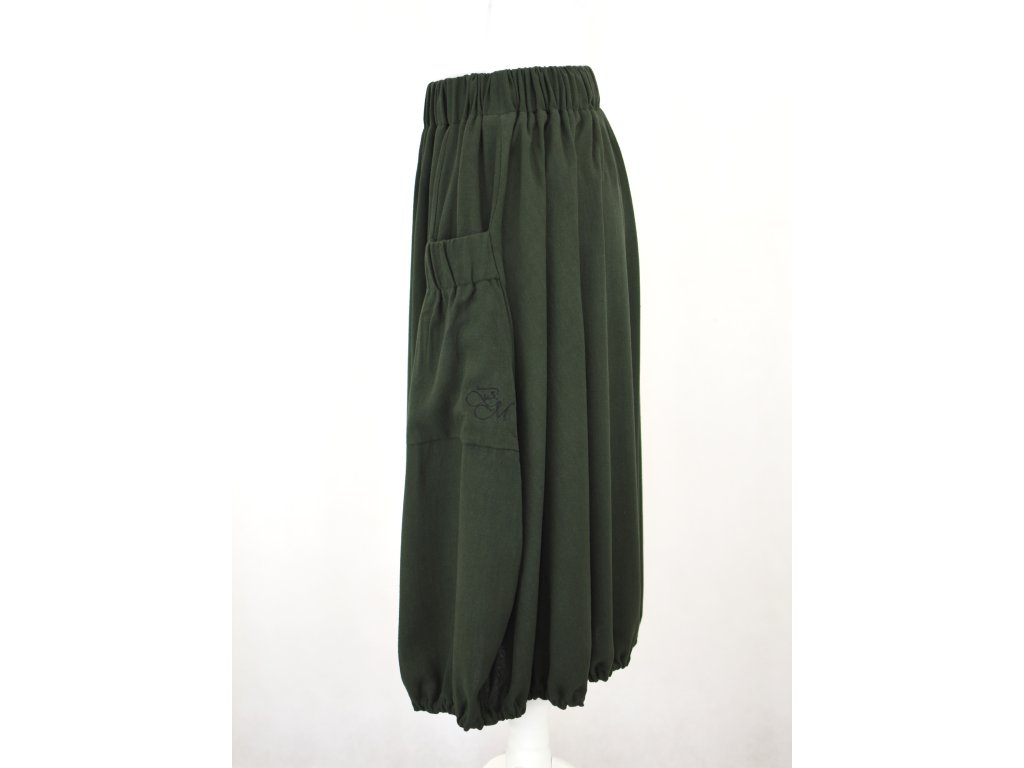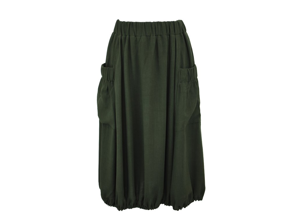 Dámská sukně áčkového až rovnějšího střihu zakončená gumičkou pro balonový efekt. Přední strana je tvořena třemi díly, kterým dominují dvě velké přiznané kapsy. V pase je skrytá guma, sukně nemá podšívku. Guma ve volnější než obvykle a sukně se dá nosit ve sníženém pase/bocích.