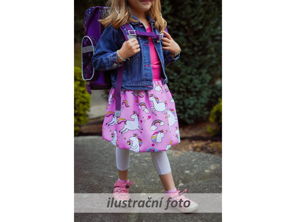 Dětská sukně balonového střihu s dvojitým elastickým pasovým okrajem. Podšité polyesterovou látkou, která je vhodná na punčošky i holé nohy. V pase je nechán otvor a jím protažená stuha, která pas stáhne a zároveň je zdobným prvkem… : ) Nemá kapsy. Rozložení vzoru se může mírně lišit.