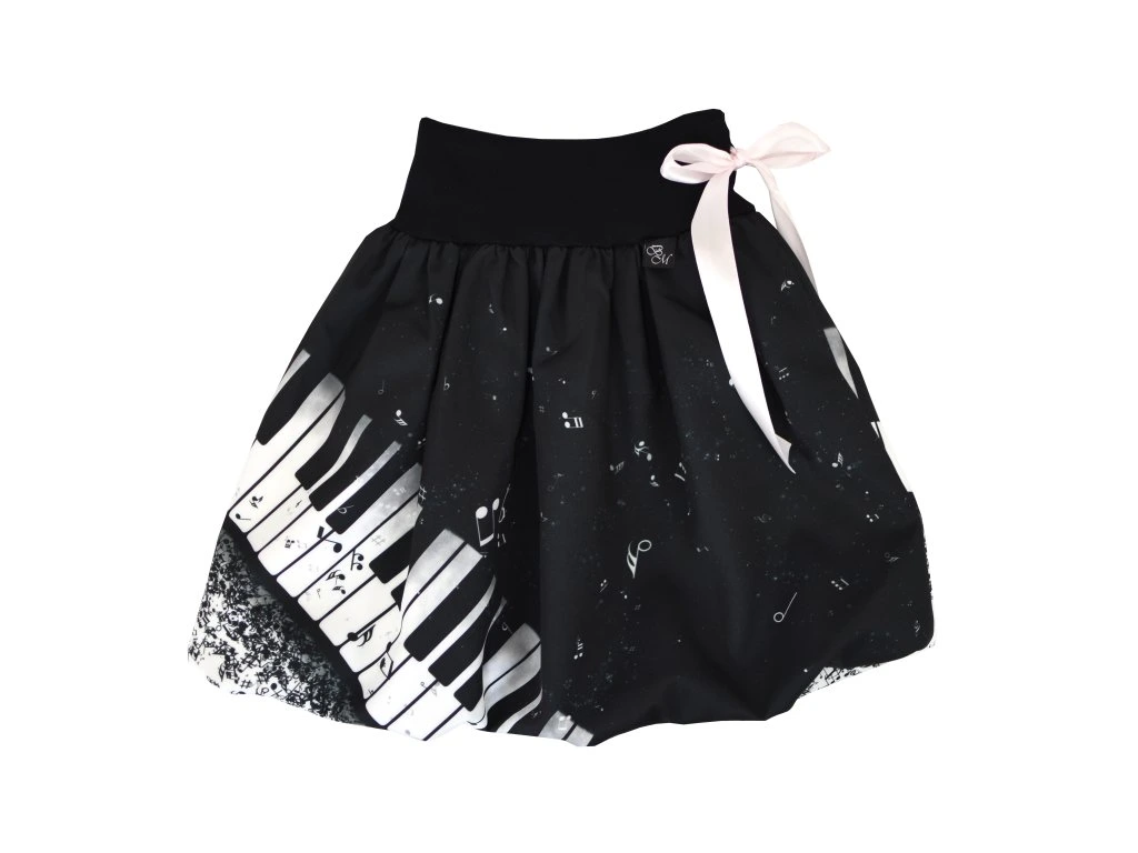 Dětská sukně balonového střihu s dvojitým elastickým pasovým okrajem. Podšité polyesterovou látkou, která je vhodná na punčošky i holé nohy. V pase je nechán otvor a jím protažená stuha, která pas stáhne a zároveň je zdobným prvkem… : ) Nemá kapsy. Rozložení vzoru se může mírně lišit.