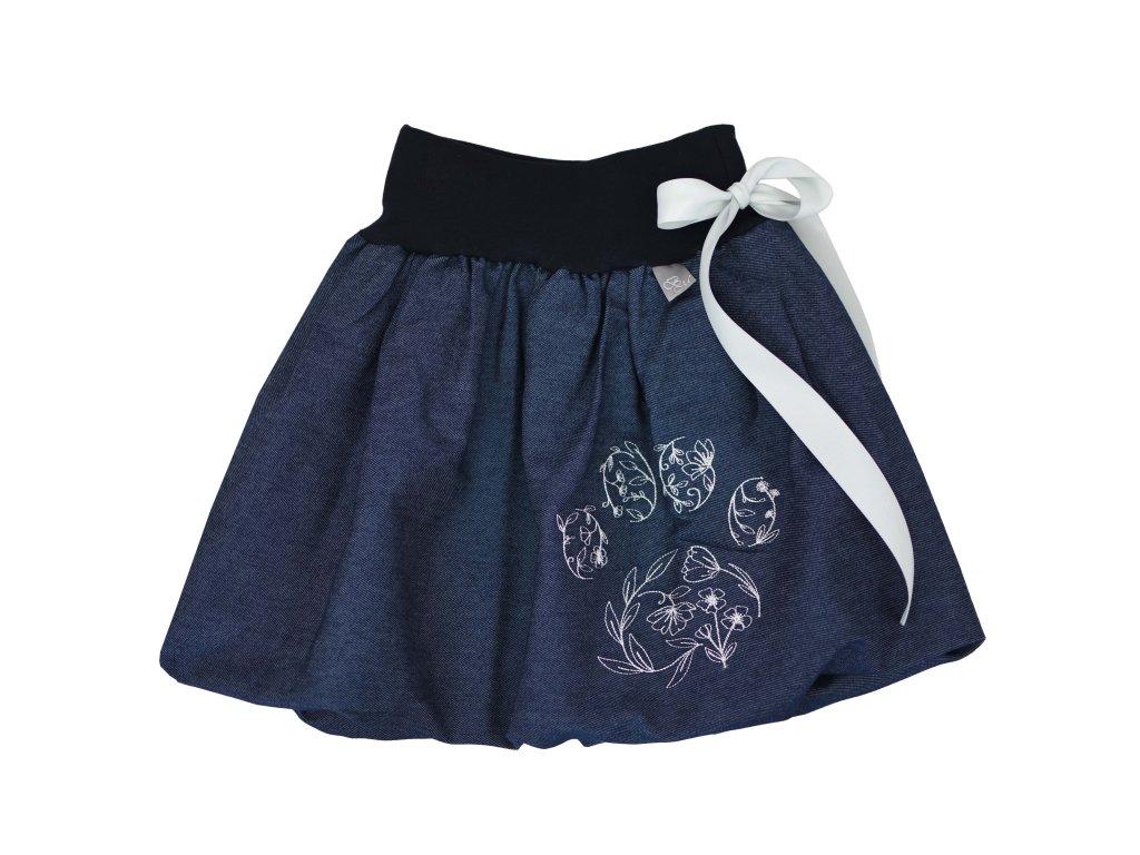 Dětská sukně balonového střihu s dvojitým elastickým pasovým okrajem. Podšité polyesterovou látkou, která je vhodná na punčošky i holé nohy. V pase je nechán otvor a jím protažená stuha, která pas stáhne a zároveň je zdobným prvkem… : )