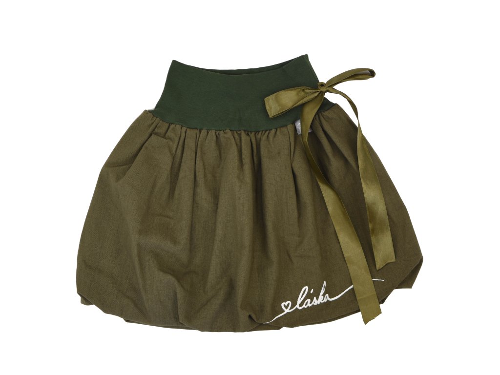 Dětská sukně balonového střihu s dvojitým elastickým pasovým okrajem. Podšité polyesterovou látkou, která je vhodná na punčošky i holé nohy. V pase je nechán otvor a jím protažená stuha, která pas stáhne a zároveň je zdobným prvkem… : ) Nápis vytvořen metodou sítotisku.