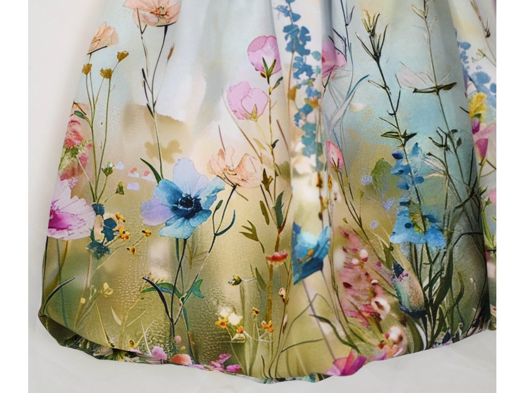 Dětská sukně balonového střihu s dvojitým elastickým pasovým okrajem. Podšité polyesterovou látkou, která je vhodná na punčošky i holé nohy. V pase je nechán otvor a jím protažená stuha, která pas stáhne a zároveň je zdobným prvkem… : )