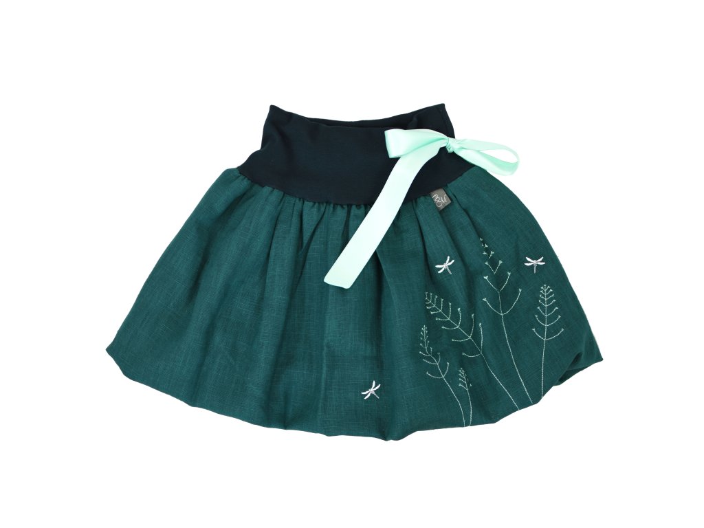 Dětská sukně balonového střihu s dvojitým elastickým pasovým okrajem. Podšité polyesterovou látkou, která je vhodná na punčošky i holé nohy. V pase je nechán otvor a jím protažená stuha, která pas stáhne a zároveň je zdobným prvkem… : )
