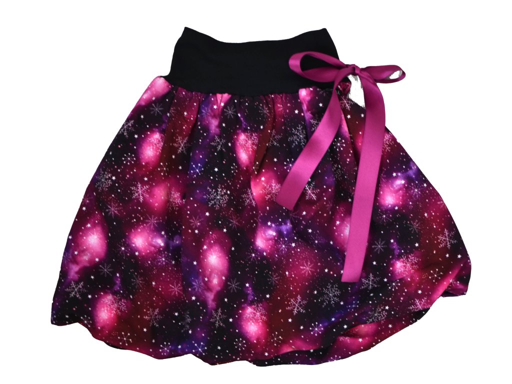 Dětská sukně balonového střihu s dvojitým elastickým pasovým okrajem. Podšité polyesterovou látkou, která je vhodná na punčošky i holé nohy. V pase je nechán otvor a jím protažená stuha, která pas stáhne a zároveň je to zdobný prvek… : )