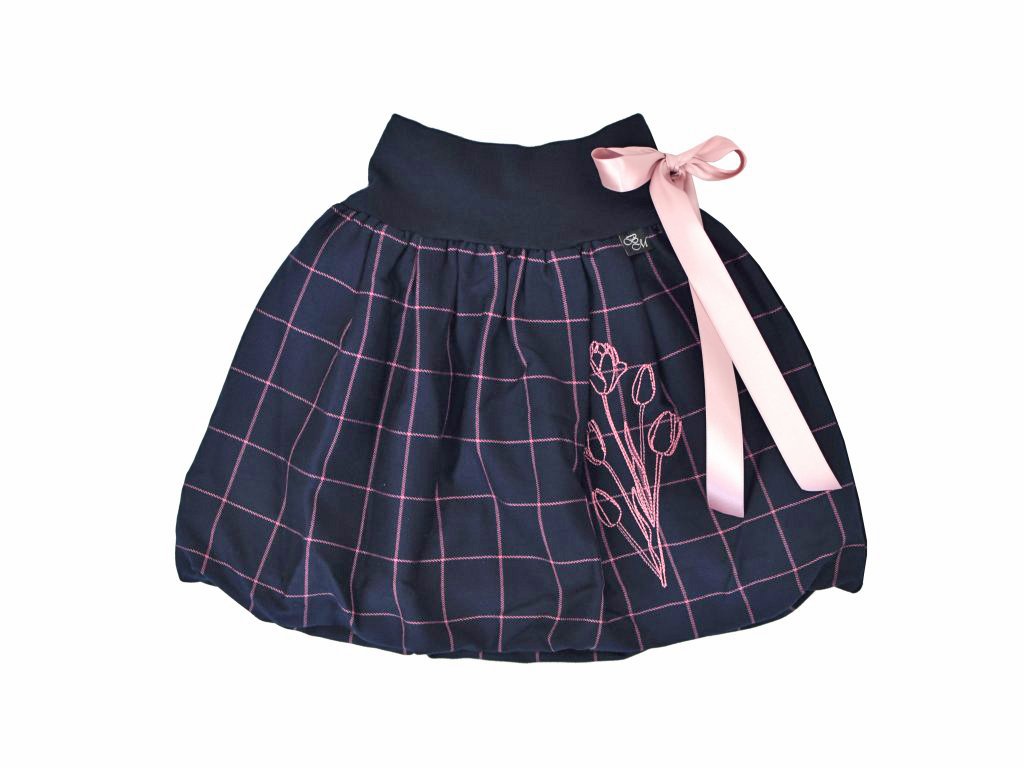 Dětská sukně balonového střihu s dvojitým elastickým pasovým okrajem. Podšité polyesterovou látkou, která je vhodná na punčošky i holé nohy. V pase je nechán otvor a jím protažená stuha, která pas stáhne a zároveň je to zdobný prvek… : )