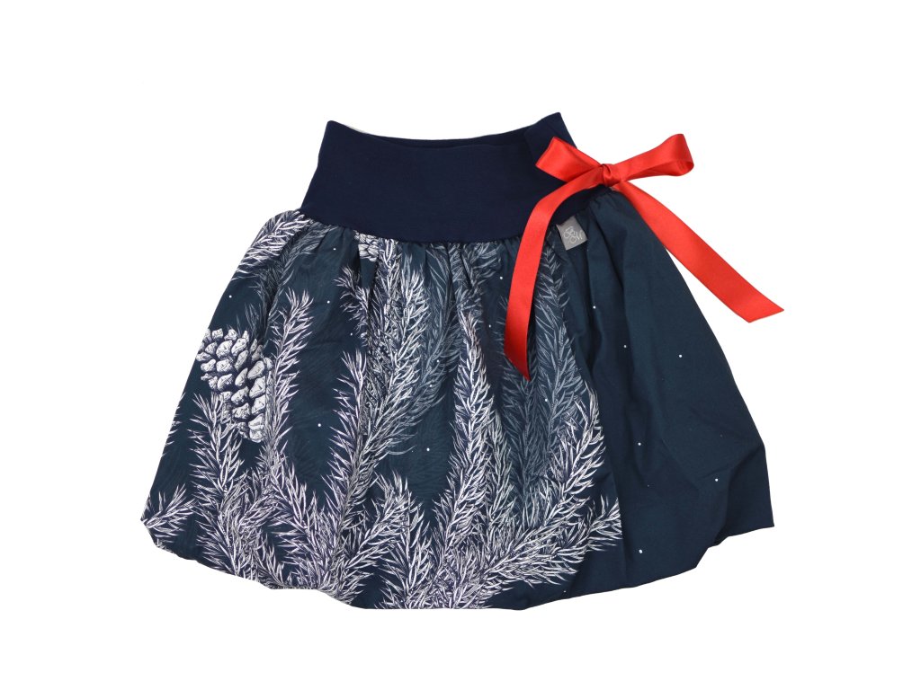 Dětská sukně balonového střihu s dvojitým elastickým pasovým okrajem. Podšité polyesterovou látkou, která je vhodná na punčošky i holé nohy. V pase je nechán otvor a jím protažená stuha, která pas stáhne a zároveň je zdobným prvkem… : ) Nemá kapsy.