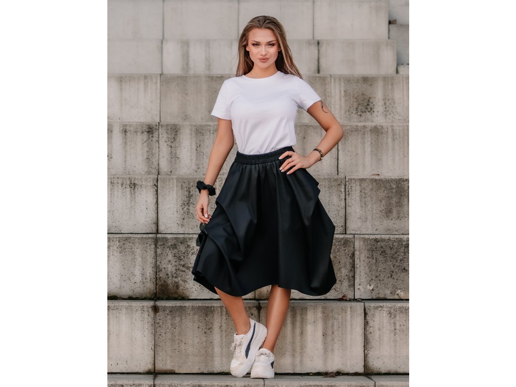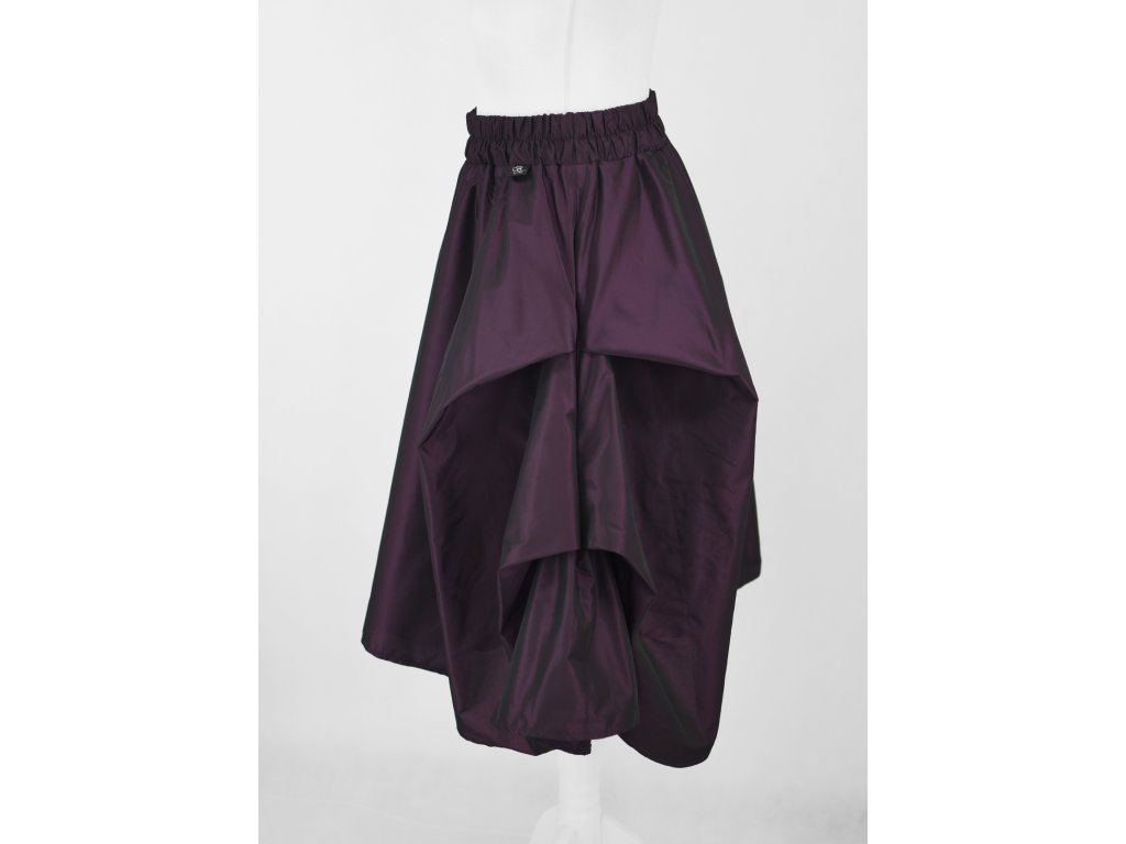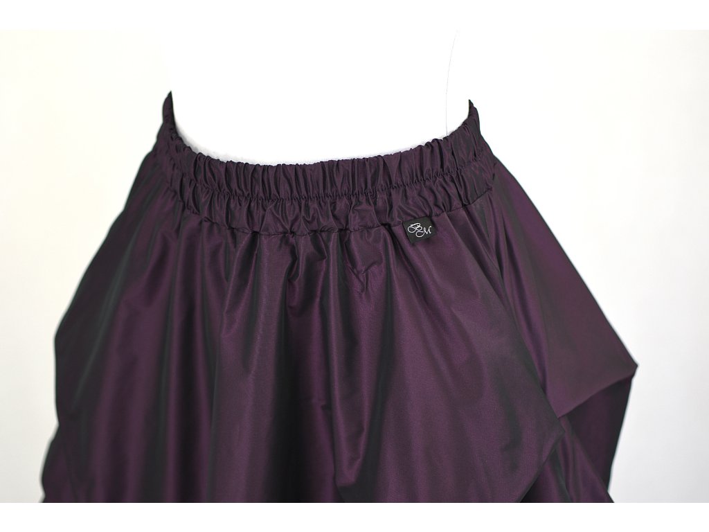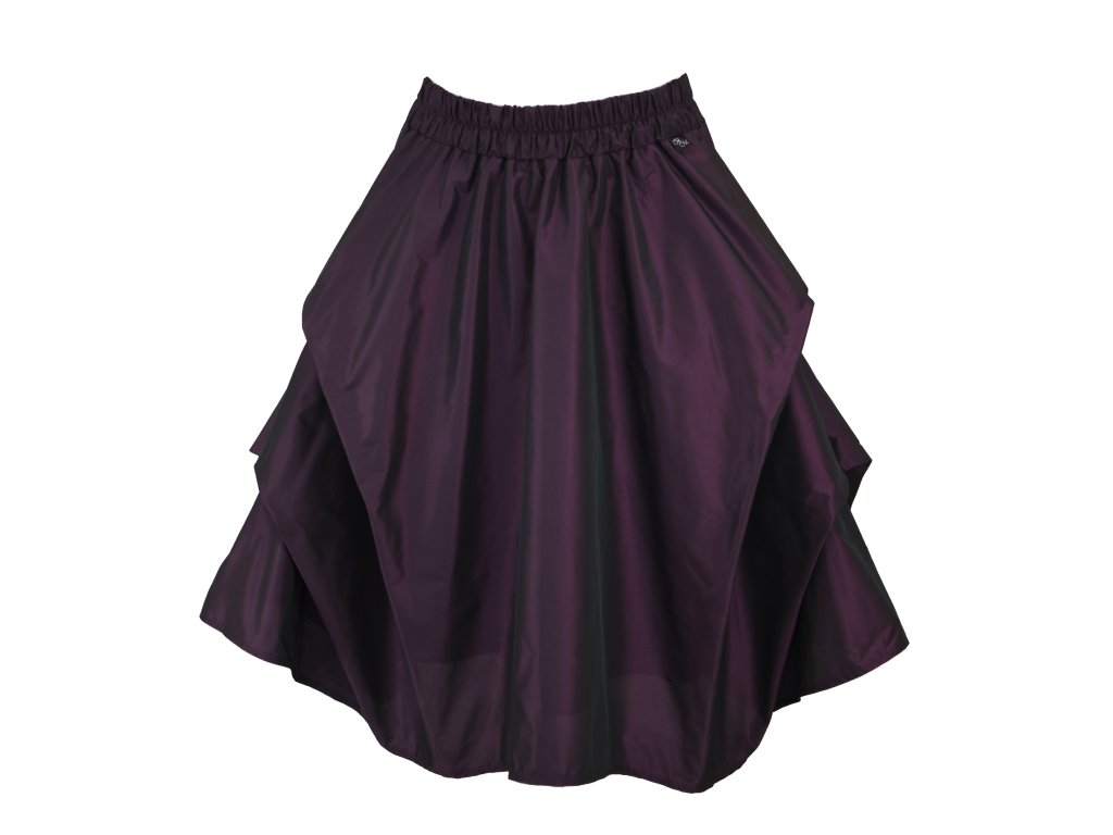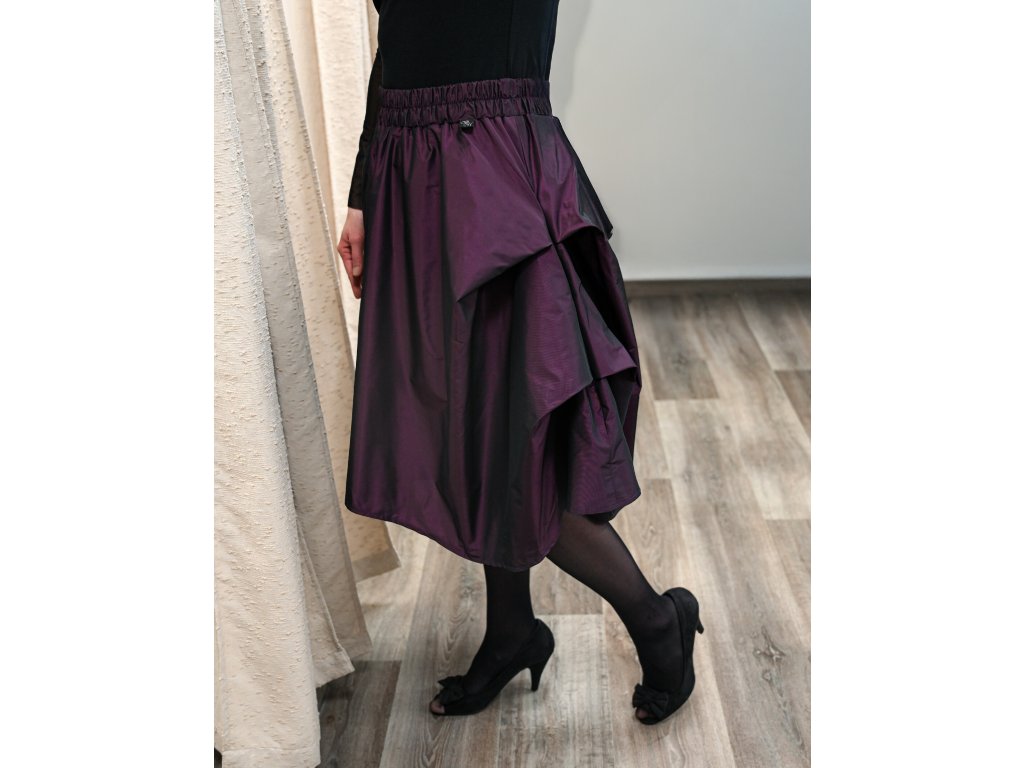 Dámská sukně půlkolového střihu se symetrickými sklady na obou bocích. Ty tvoří tři cípy a dělají na sukni zajímavý prvek s bohatým objemem. V pase má skrytou prošitou gumu, v bocích jsou dvě skryté kapsy. Délka je lehce asymetrická, zadní díl je o 5 cm delší.