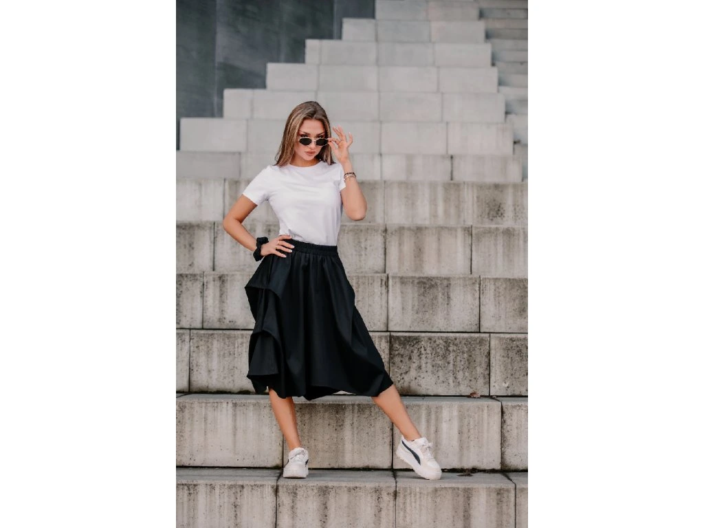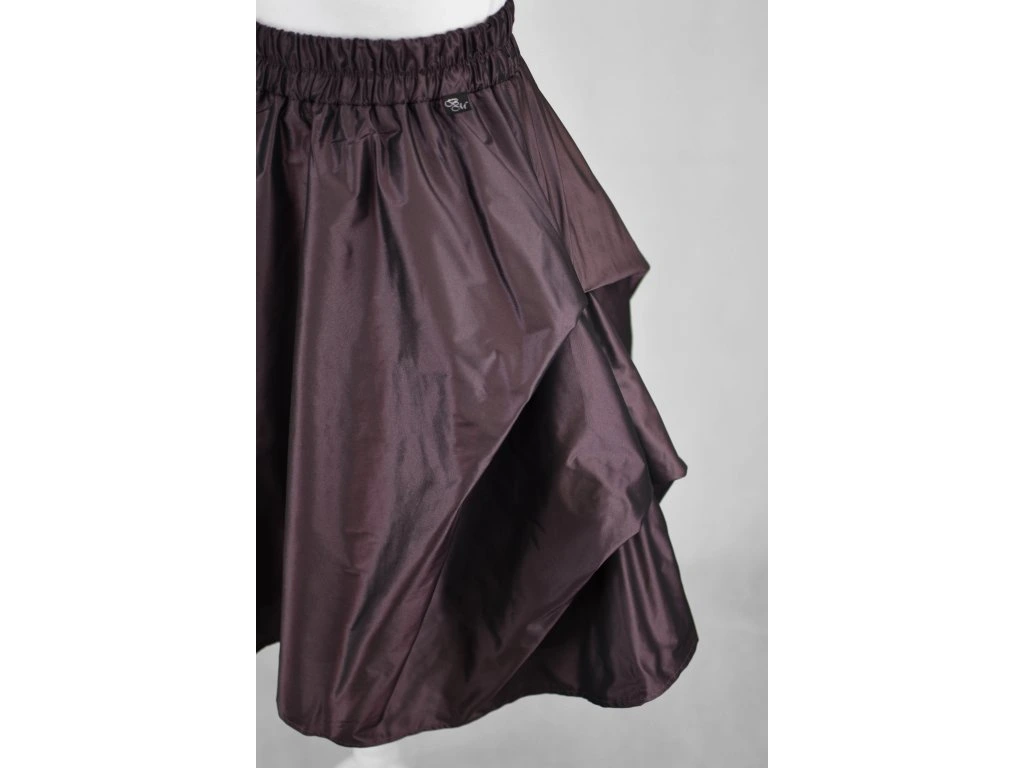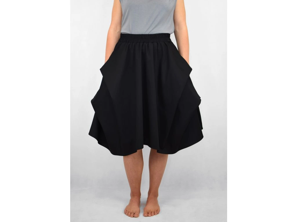 Dámská sukně půlkolového střihu se symetrickými sklady na obou bocích. Ty tvoří tři cípy a dělají na sukni zajímavý prvek s bohatým objemem. V pase má skrytou prošitou gumu, v bocích jsou dvě skryté kapsy. Délka je lehce asymetrická, zadní díl je o 5 cm delší.