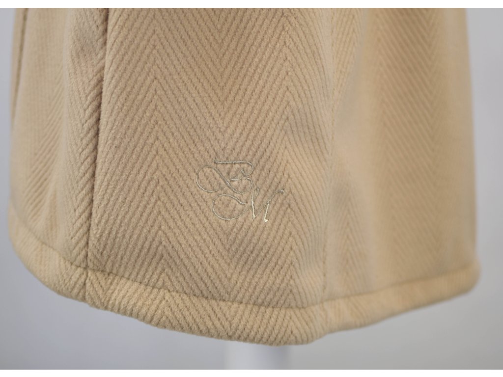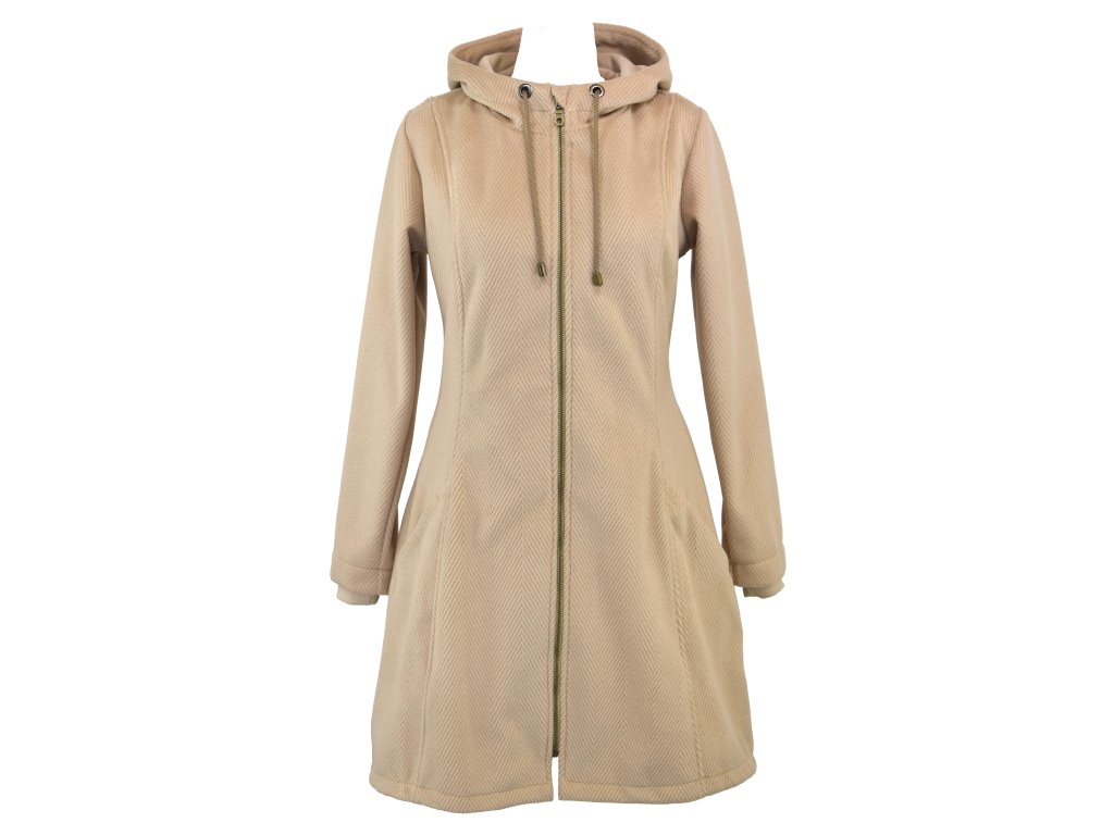 Dámský flaušový kabát áčkového střihu. Střih je projmutý do pasu, zadní díl je stažený do pevně všité gumy. V horní části je úzký, postupně se rozšiřuje. V dolním okraji se dá stáhnout gumičkou na obou stranách. Zadní délka je delší než přední část. Je kompletně vypodšívkovaný. Kapuce je zdvojená. Kabátek má kapsy na zip - všité na předním díle.