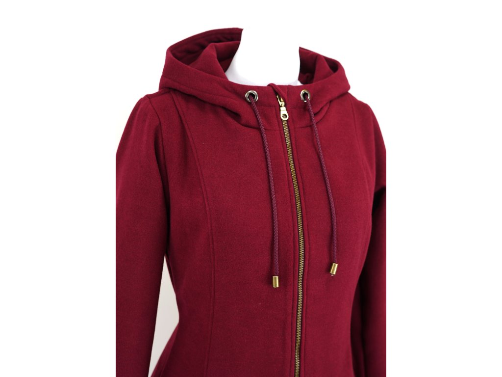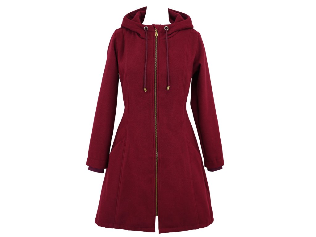 Dámský flaušový kabát áčkového střihu. Střih je projmutý do pasu, zadní díl je stažený do pevně všité gumy. V horní části je úzký, postupně se rozšiřuje. V dolním okraji se dá stáhnout gumičkou na obou stranách. Zadní délka je delší než přední část. Je kompletně vypodšívkovaný. Kapuce je zdvojená. Kabátek má kapsy na zip - všité na předním díle.