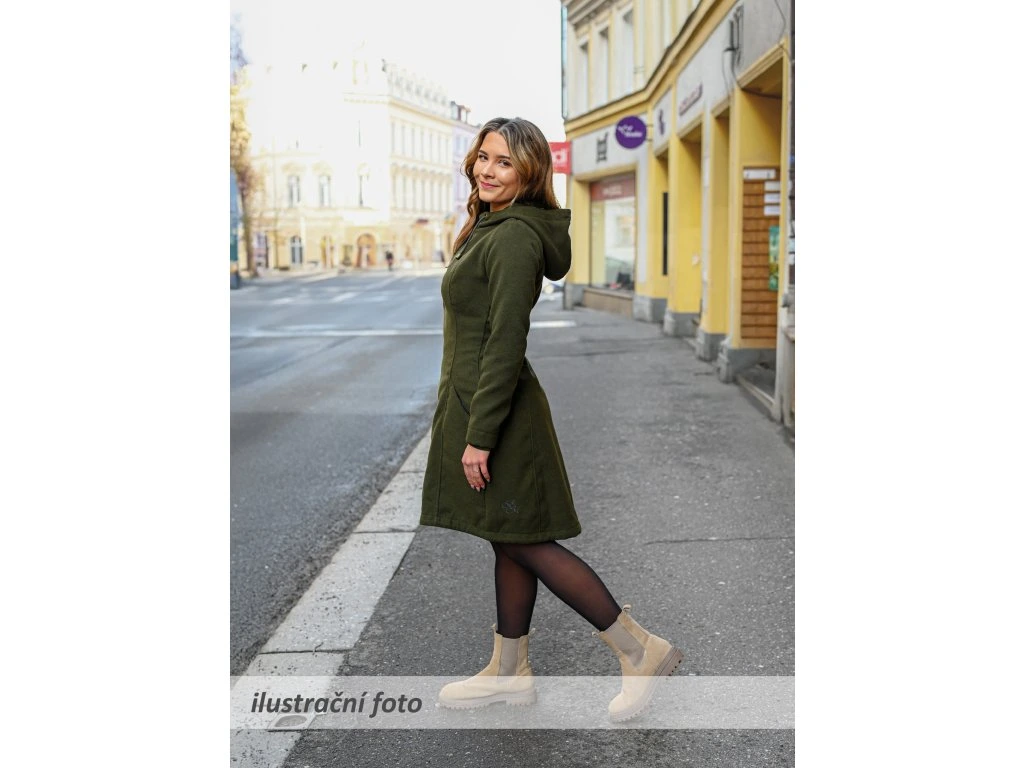 Dámský flaušový kabát áčkového střihu. Střih je projmutý do pasu, zadní díl je stažený do pevně všité gumy. V horní části je úzký, postupně se rozšiřuje. V dolním okraji se dá stáhnout gumičkou na obou stranách. Zadní délka je delší než přední část. Je kompletně vypodšívkovaný. Kapuce je zdvojená. Kabátek má kapsy na zip - všité na předním díle.