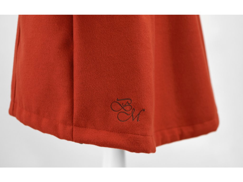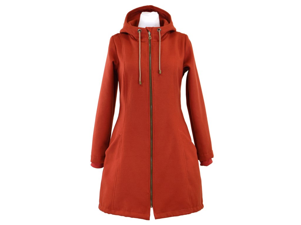 Dámský flaušový kabát áčkového střihu. Střih je projmutý do pasu, zadní díl je stažený do pevně všité gumy. V horní části je úzký, postupně se rozšiřuje. V dolním okraji se dá stáhnout gumičkou na obou stranách. Zadní délka je delší než přední část. Je kompletně vypodšívkovaný. Kapuce je zdvojená. Kabátek má kapsy na zip - všité na předním díle.