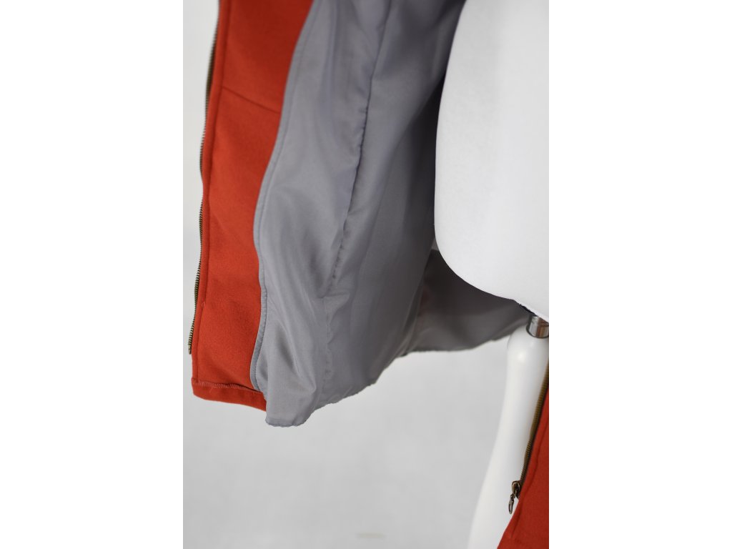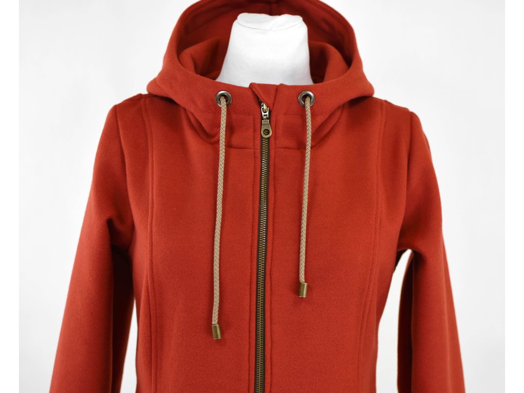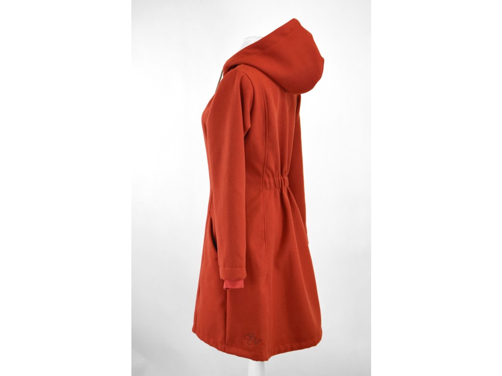 Dámský flaušový kabát áčkového střihu. Střih je projmutý do pasu, zadní díl je stažený do pevně všité gumy. V horní části je úzký, postupně se rozšiřuje. V dolním okraji se dá stáhnout gumičkou na obou stranách. Zadní délka je delší než přední část. Je kompletně vypodšívkovaný. Kapuce je zdvojená. Kabátek má kapsy na zip - všité na předním díle.