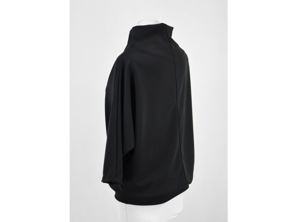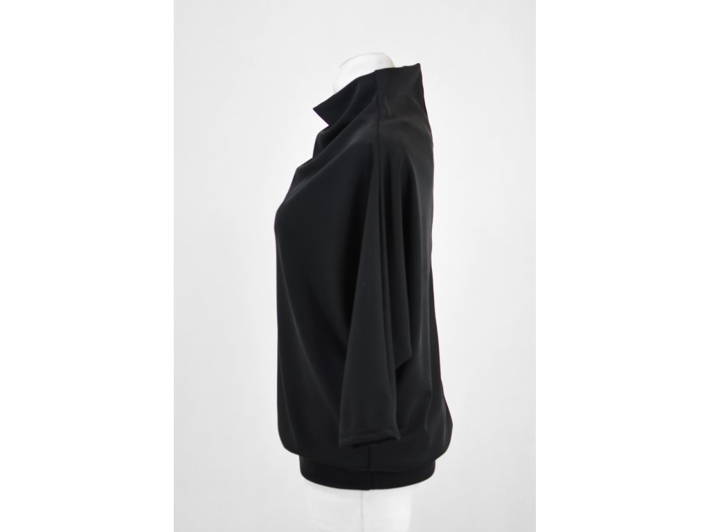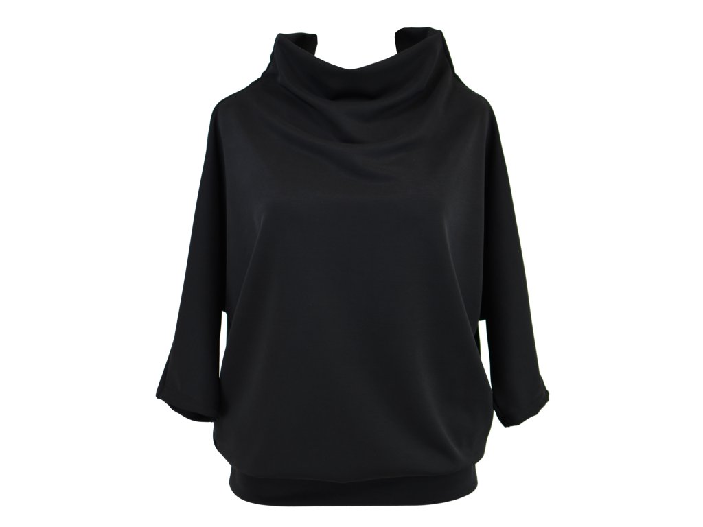 Dámská halenka netopýřího střihu s volnějším dvojitým stojáčkem. Rukávy jsou netopýřího střihu, 3/4 délky. Je s volným hrudníkem a je podkasaná do dvojitého lemu v dolním okraji. Působí volně a ležérně. Díky silnějšímu materiálu se hodí spíše jako svrchní vrstva, zároveň ji však můžete nosit i samostatně jako tričko.