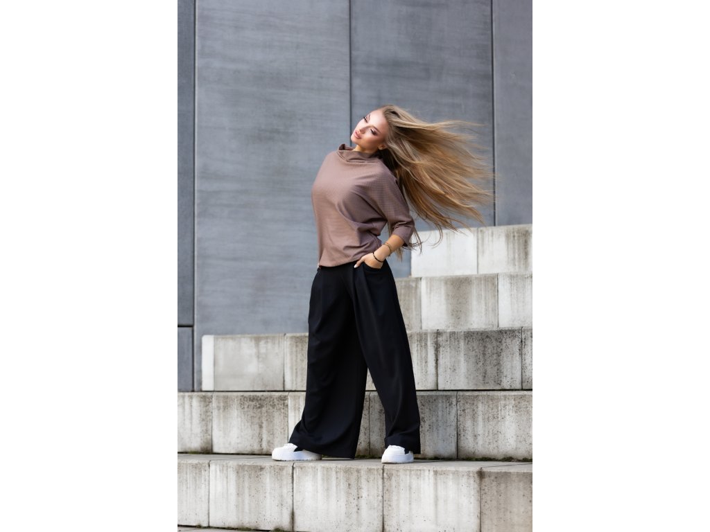 Dámská halenka netopýřího střihu s volnějším dvojitým stojáčkem. Rukávy jsou netopýřího střihu, 3/4 délky. Je s volným hrudníkem a je podkasaná do dvojitého lemu v dolním okraji. Působí volně a ležérně.