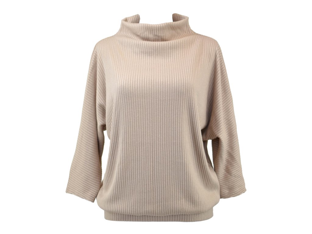 Dámská halenka netopýřího střihu s volnějším dvojitým stojáčkem. Rukávy jsou netopýřího střihu, 3/4 délky. Je s volným hrudníkem a je podkasaná do dvojitého lemu v dolním okraji. Působí volně a ležérně.